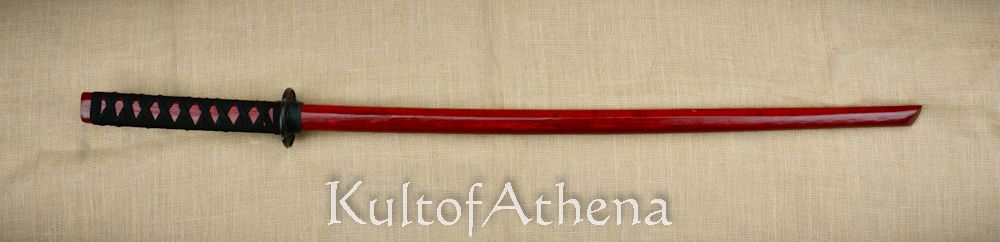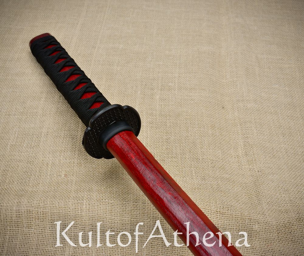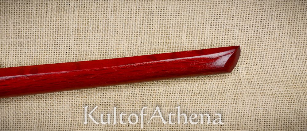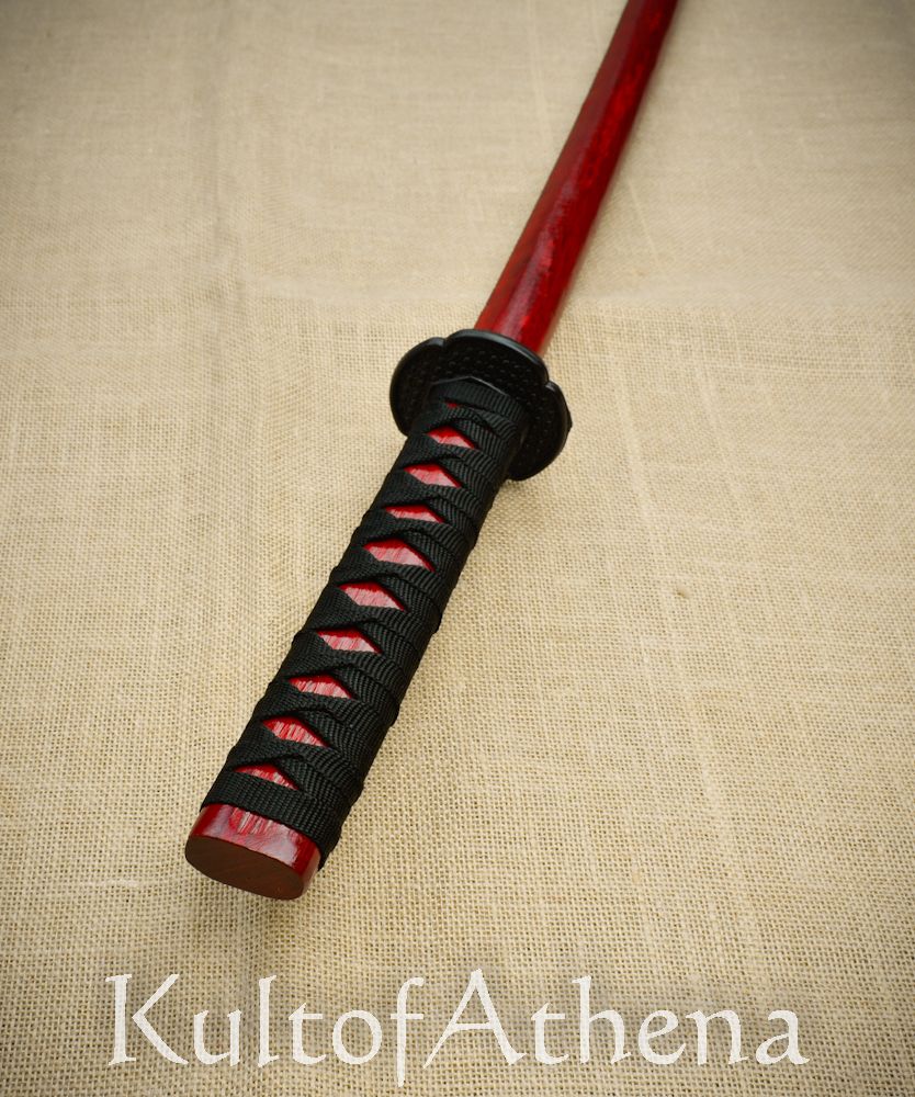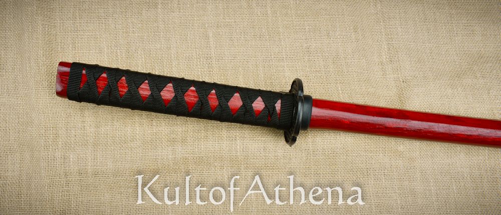 The Red Dragon Bokken is crafted from durable wood finished in brilliant red. The tsuba guard is hard plastic which is held in place with a rubber habaki retainer. A wrap of black cord completes the bokken.