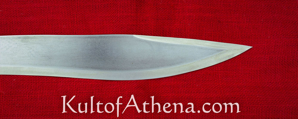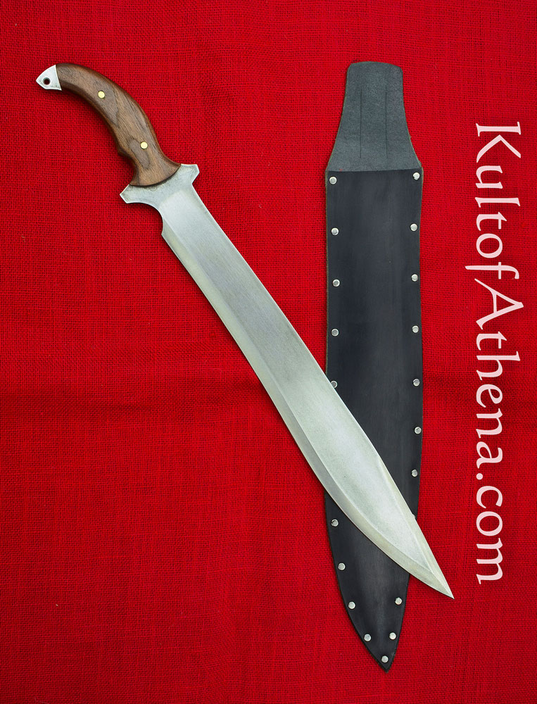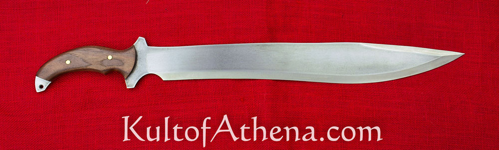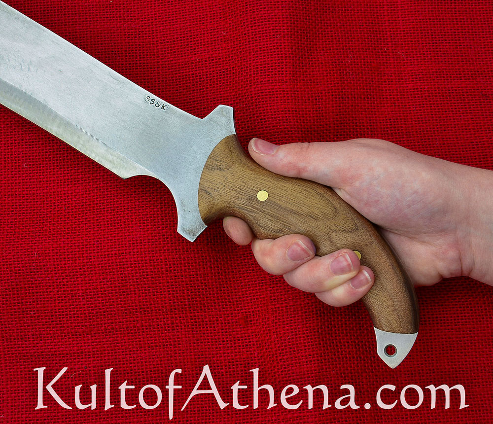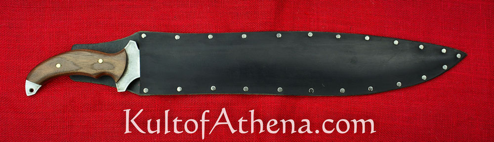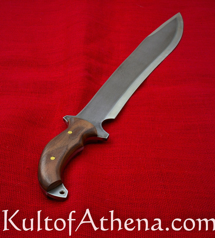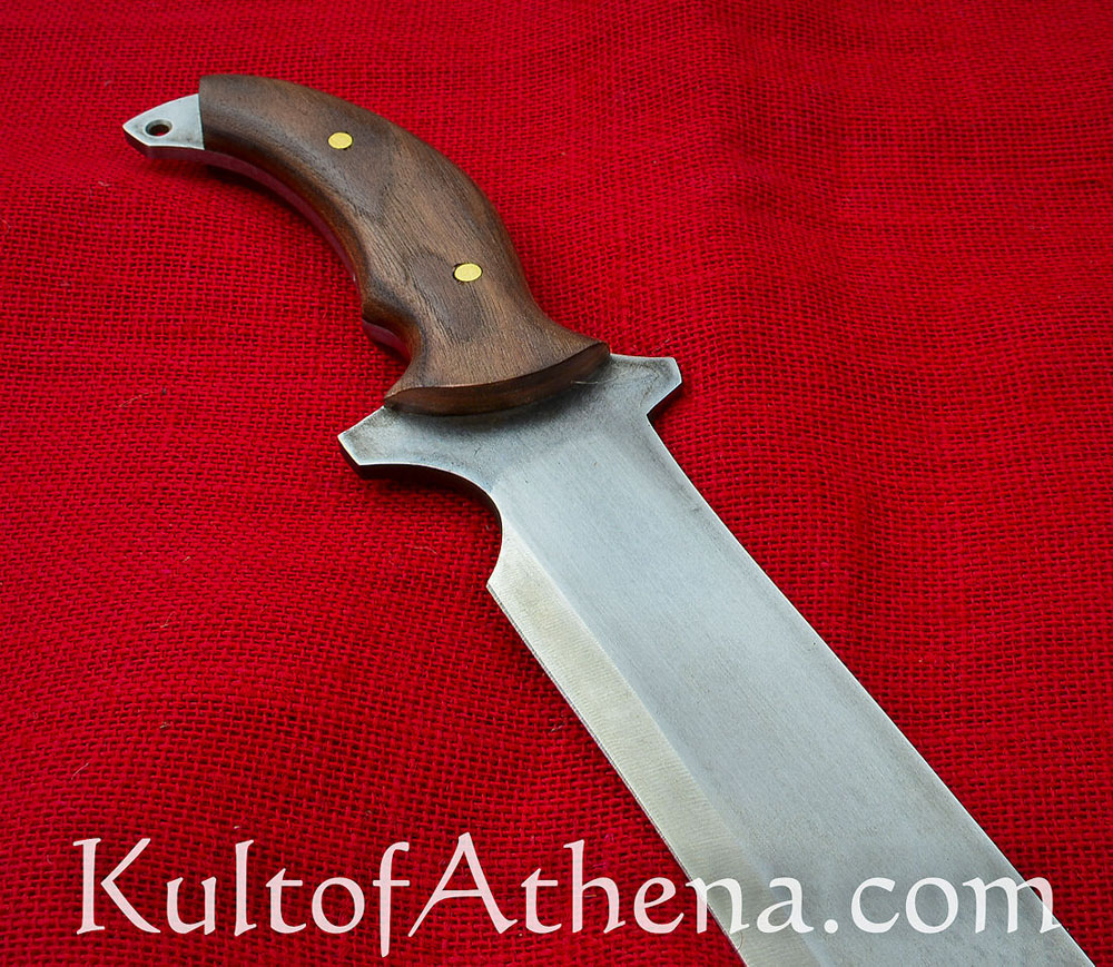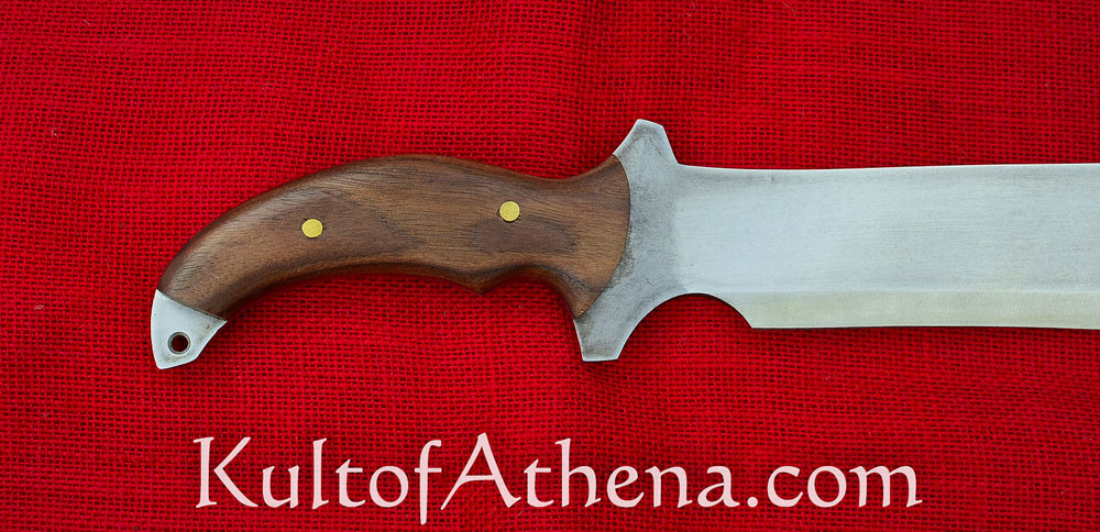 This large machete is inspired by one seen in the game Resident Evil 5. It has a wide tip designed to give extra weight and momentum in the swing, giving it great power in its chops and hacks. The blade is thick-spined and of sharpened high carbon 1095 steel. The grip is of wood and is riveted over the thick tang.