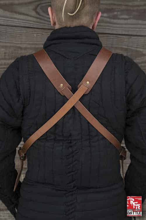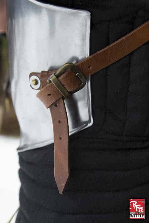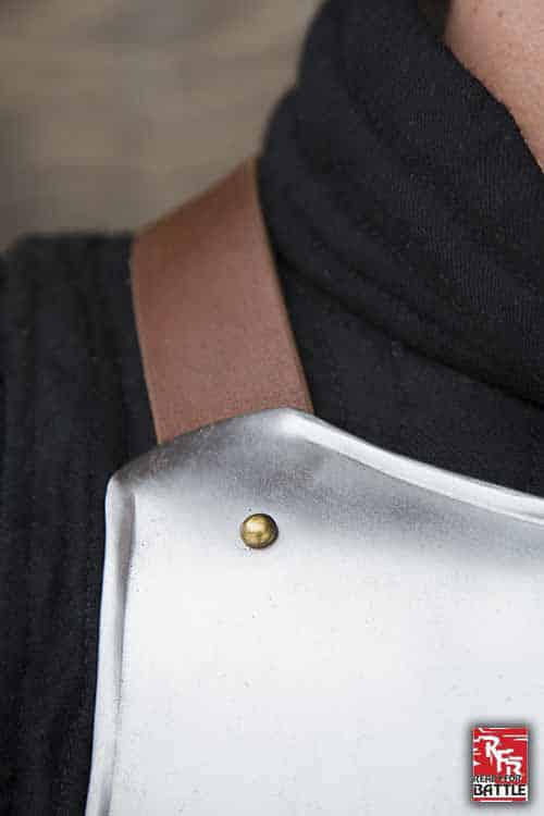 Secure the RFB Breastplate by tightening the 4 cm wide leather straps across the back, keeping the breastplate in place over your gambeson. Made of polished 1 mm thick mild steel and top-grain leather straps and fittings, this armour piece is built to withstand the abuse of a LARP or reenactment with regular leather and metal armour care.