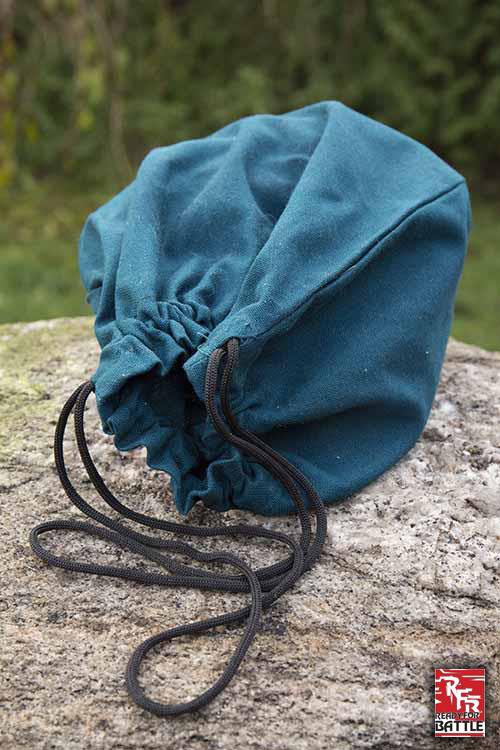 Epic Armourys Ready-for-Battle Purse is a moderately sized cloth purse designed to hold coins or other personal keepsakes. The round bottomed purse is made from medium cotton and is tied shut with a cotton cord drawstring. The same drawstring is long enough that it can be tied to your belt in order to keep it close at hand.