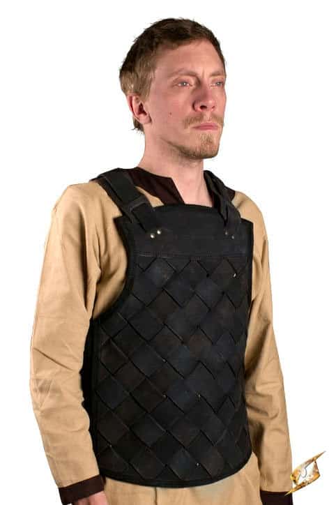 This bestselling Ready-for-Battle Viking Leather Armour is a leather cuirass that protects the torso on all sides. Made from chrome-tanned, plated leather bands set in a diagonal weave on the front, this armor is both a distinct and practical addition to your kit.
