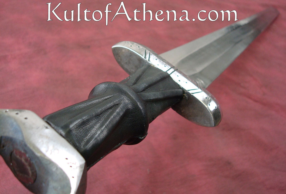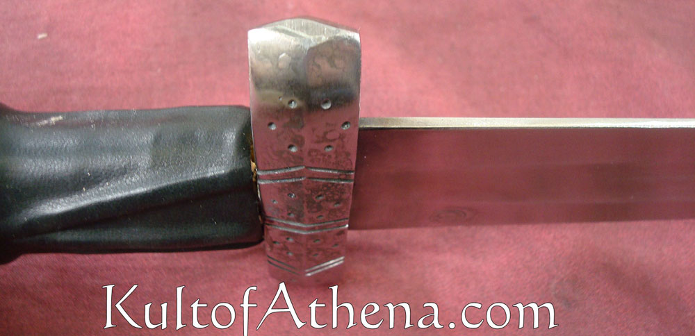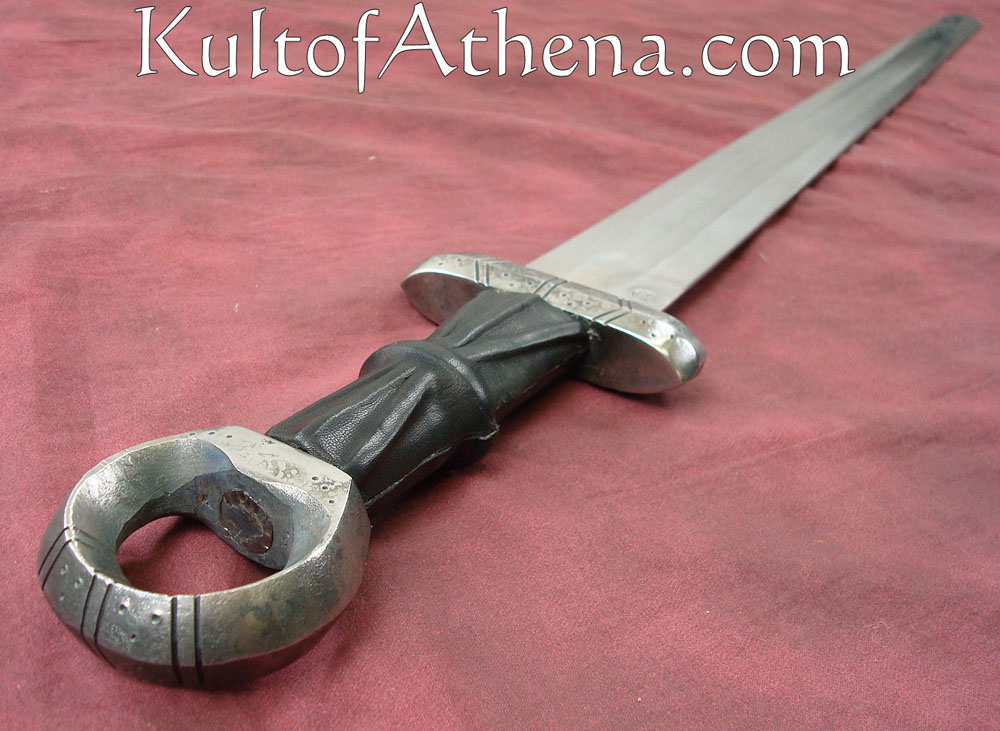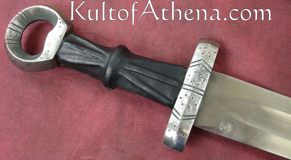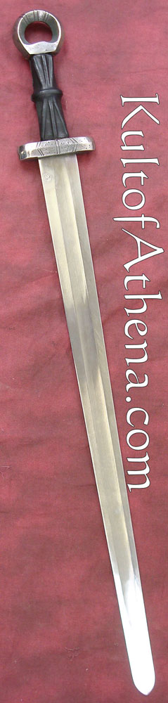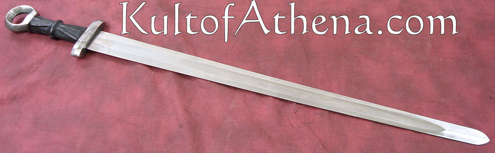 This sword, inspired by Viking Swords, was made in the Czech Republic. It has a blunt blade of high carbon steel tempered to a 50-52 HRC. The grip is wrapped in leather and the crossguard and pommel are antiqued for an aged appearance. Created for stage combat, the blade edges are thick and blunt.