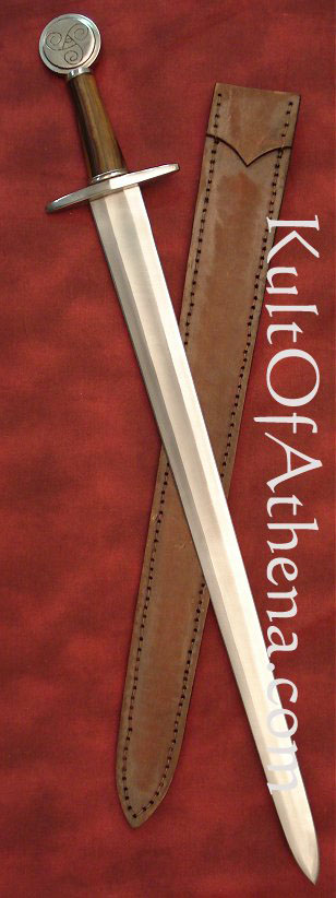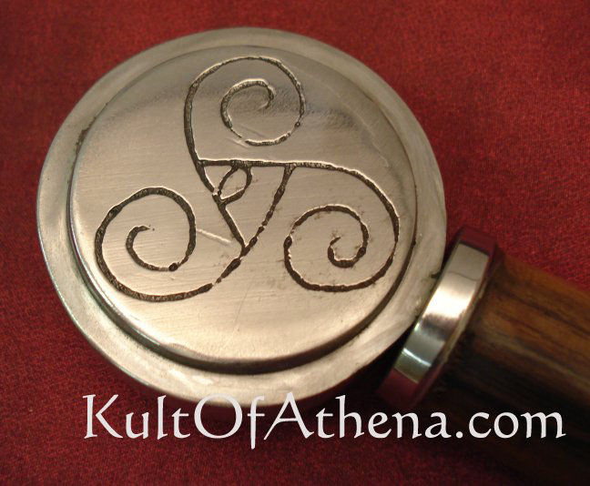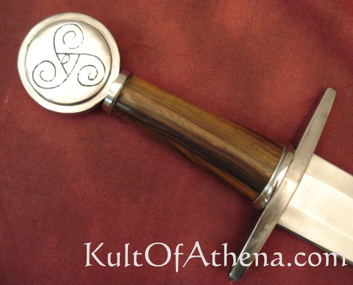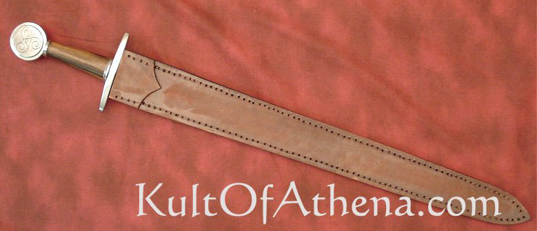 The Early Norse and Celtic people of the middle ages created simple, fully functional swords beautifully adorned with designs from their myths and legends. This beautiful sword has a curled scroll hand-engraved into its pommel… a design found on a ceremonial gilded iron helmet dating to the La Tene era. The original helm resides in the Musee des Antiquites Nationales Museum in France. Leather sheath included. From Ritter Steel.