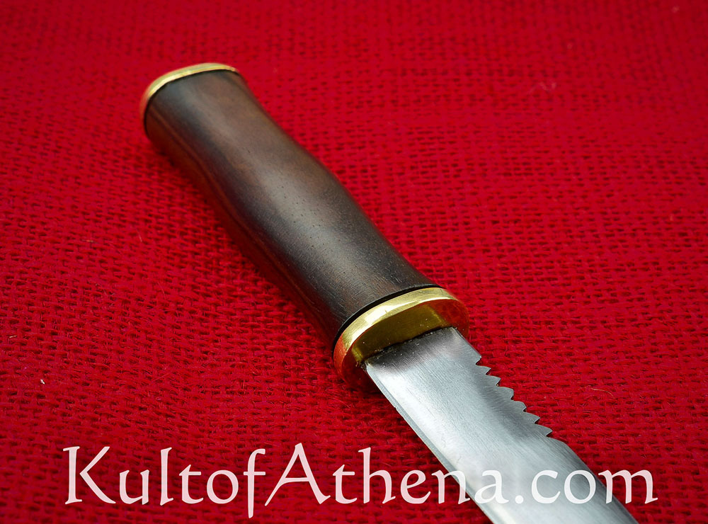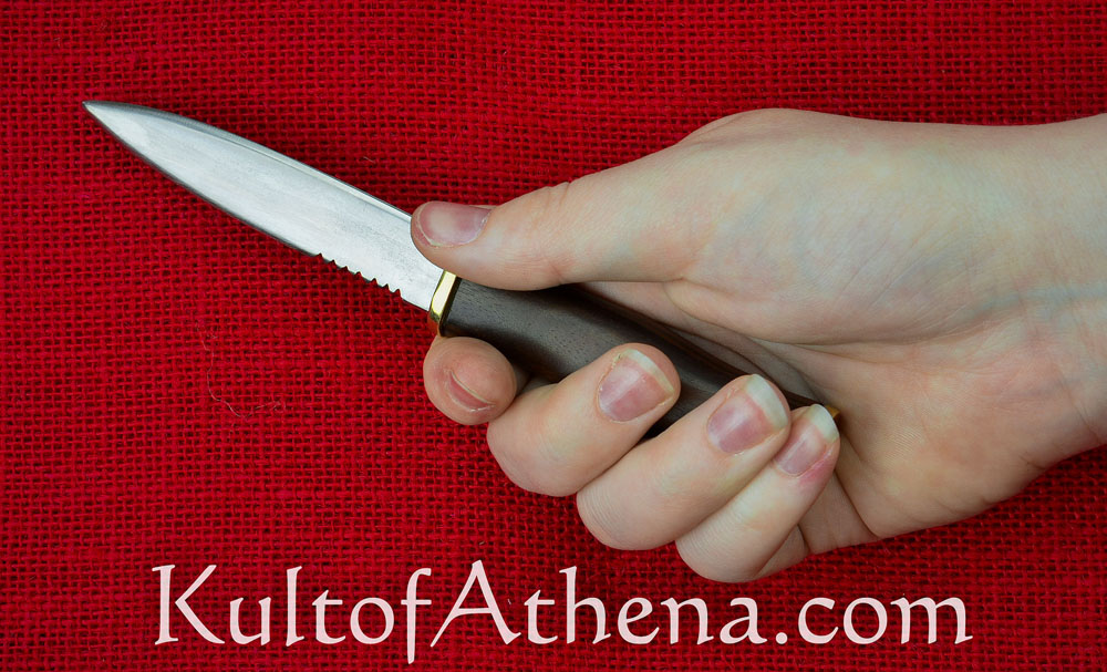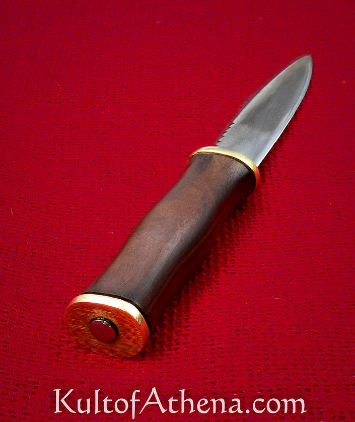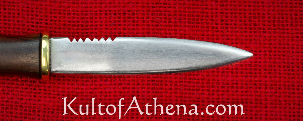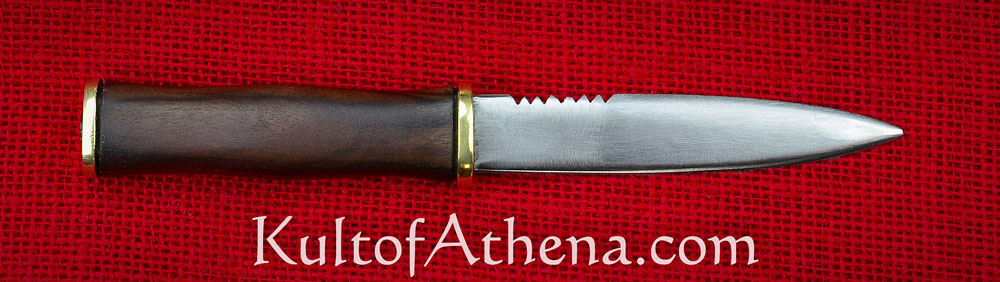 Honest, unpretentious, and reliable. This is a pretty little blade which I bought because it was one of few full-tang sgian dubhs. It feels very solid in the hand; the steel is strong, and just sharp enough to do a job while applying pressure to the raw blade without fear of cutting your finger. The wood is beautiful, not at all dyed, though it is a little lighter than I would like; the brass fittings are held in well and brilliantly polished. The only setbacks are the gaps between the fittings that look badly cut, and the sheath, which is a rather ugly matte leather on a surprisingly lightweight piece of wood; but, this latter problem will be hidden, so it is not too much of an issue, and it seems to keep the sgian dubh in place wherever you tuck it.