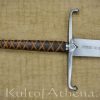 This Robert the Bruce Greatsword has a large blade forged of tempered high carbon steel; the crossguard and pommel are steel and the wooden grip is overlaid in leather and then finished with cross-hatched leather strips. This brawny Greatsword is built for delivering hefty chops and shattering blows that would give great worry to even the most well-armored of opponents. A stout crossguard and mace-like pommel double as brutal bludgeoning weapons.