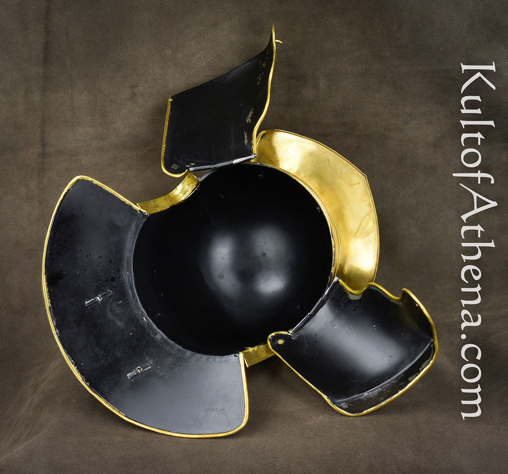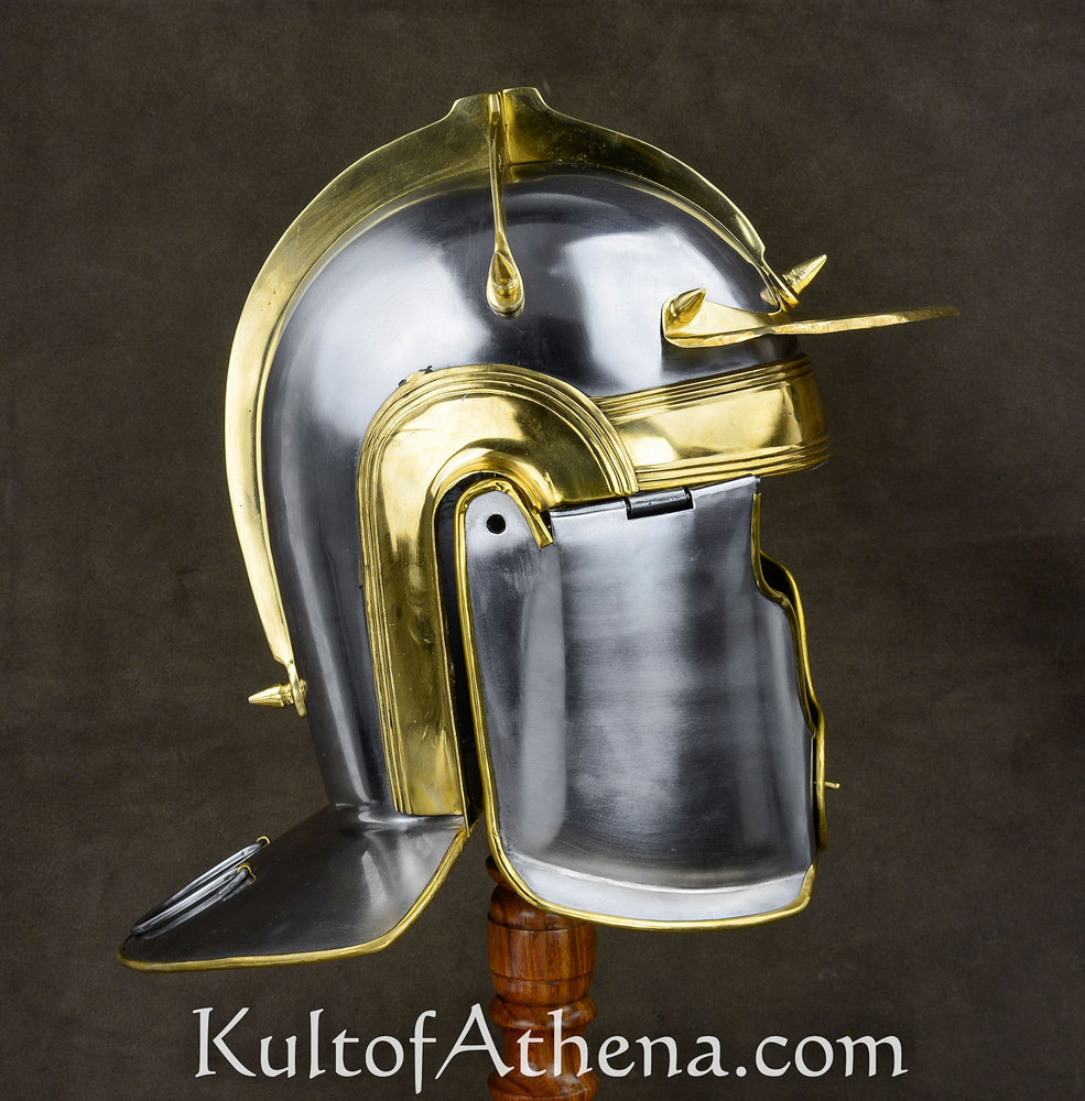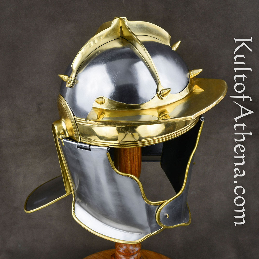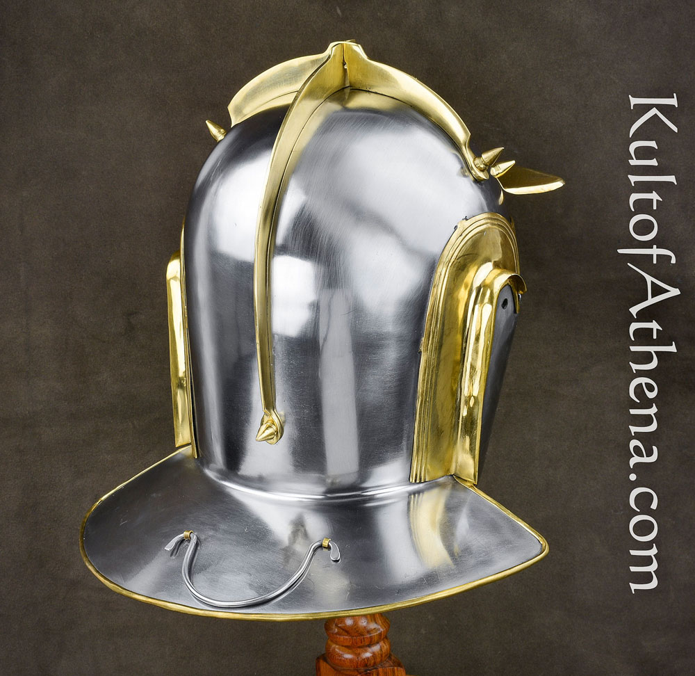 This helmet is made from thick, heavy-gauge high carbon steel with brass ridges and spikes. The cheek plates are hinged and can be held in place over the chin with a hinge. The helmet is unlined and comes with a padded arming cap insert.