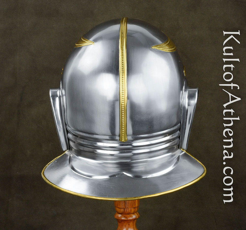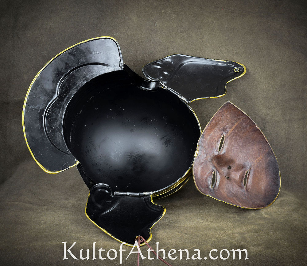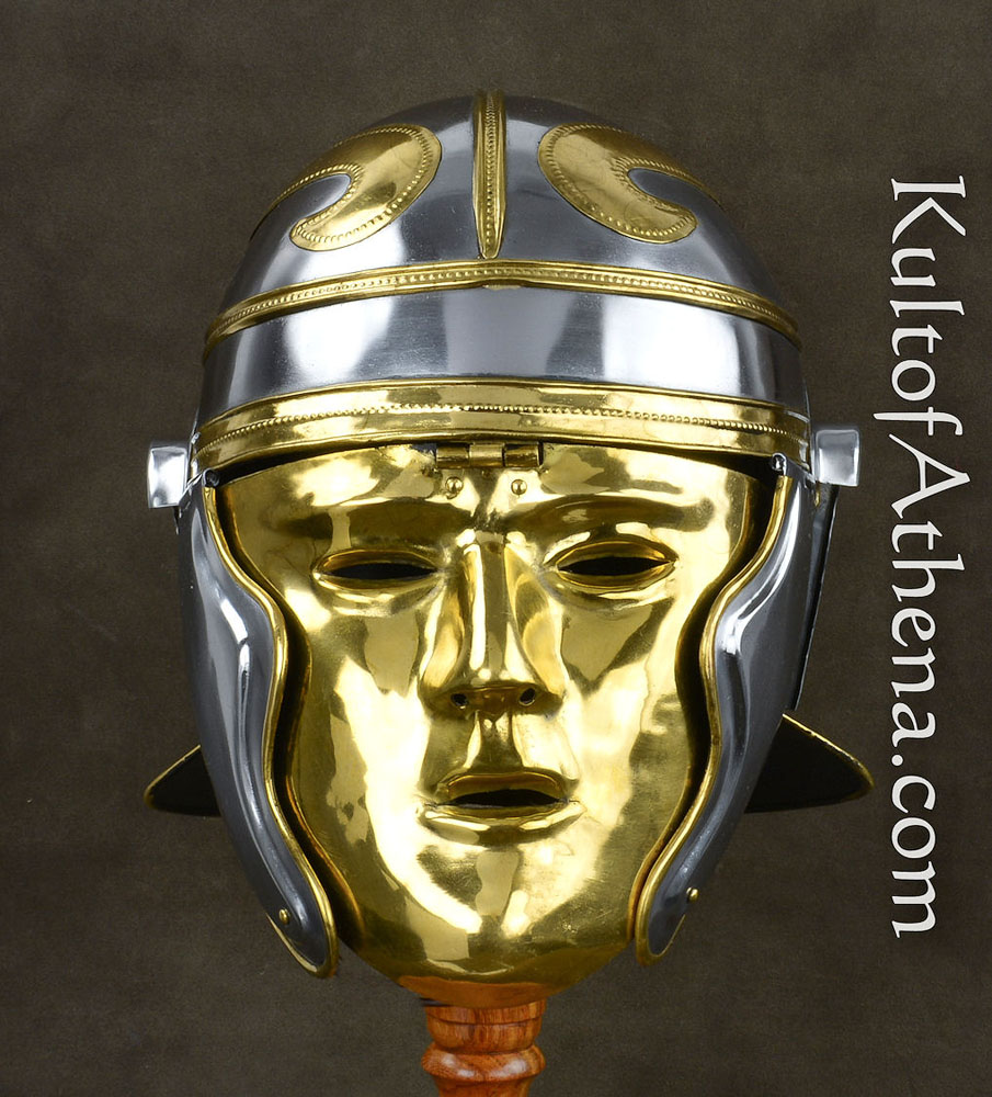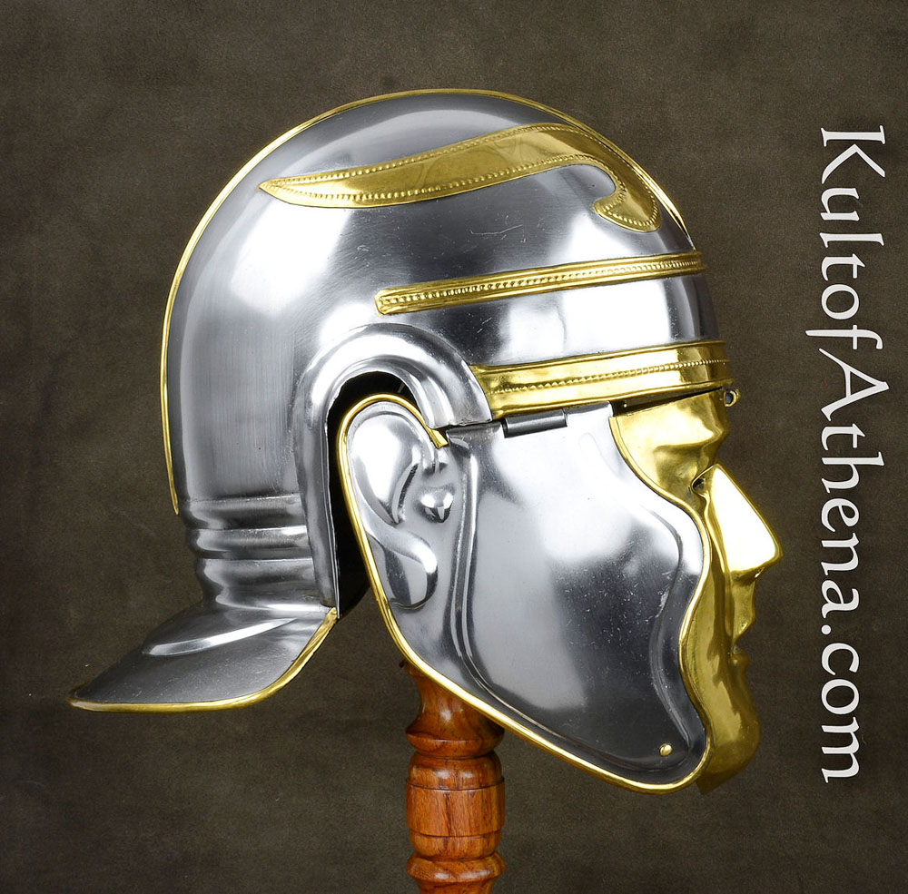 The Roman Cavalry helmet is of the standard Gallic type with the addition of a solid brass face mask hinged at the top, and cheek pieces that fully cover the ears. Made of steel with brass accents.