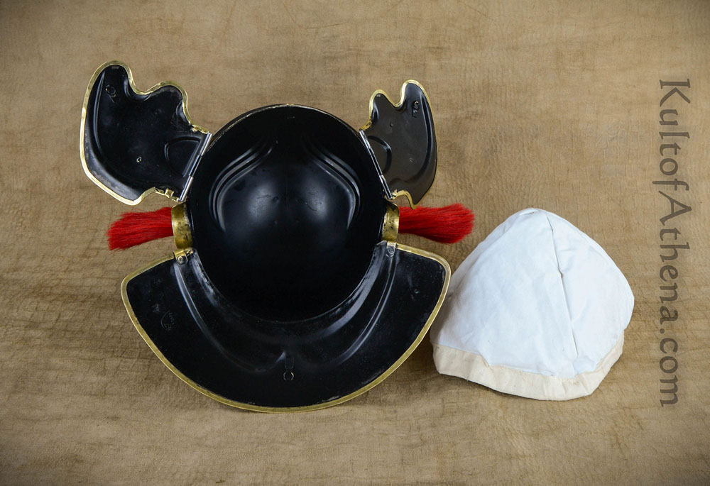 The Roman Centurion Gallic H Helm is made of 18 gauge steel with brass detailing. The cheekplates are hinged and have small rings which facilitate the attachment of a chin strap. (chin strap not included). Features a removable horse hair crest dyed bright red, as well as the brass crest holder needed to fit it atop the helmet. Includes a padded under cap.
