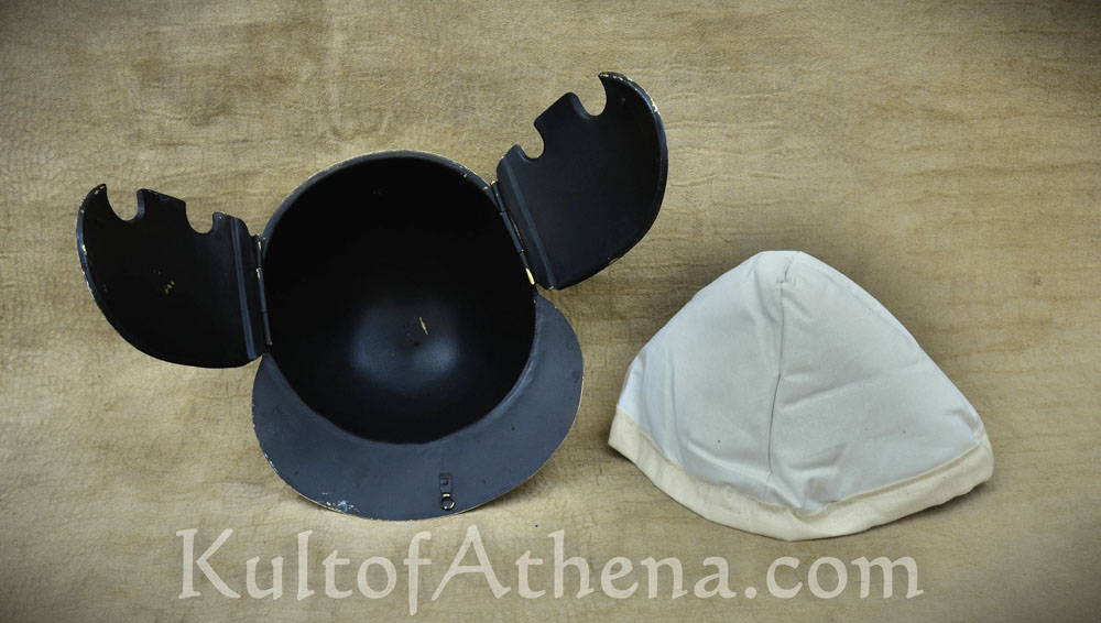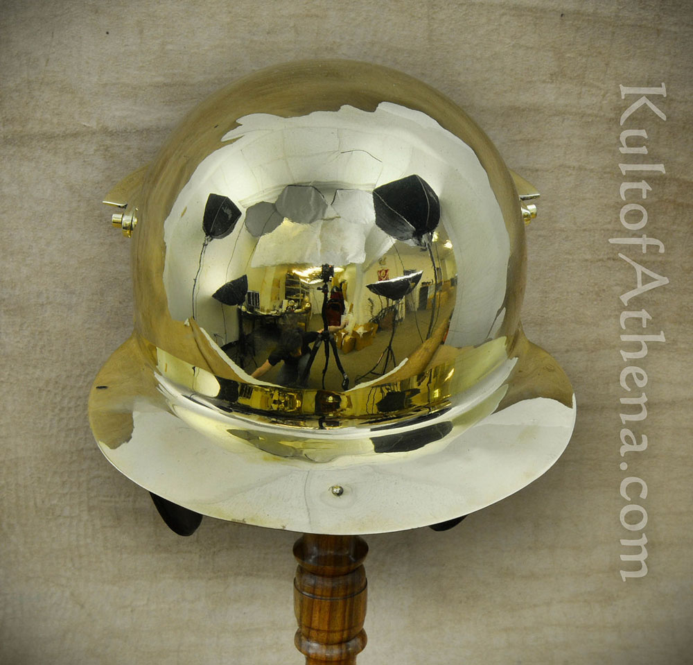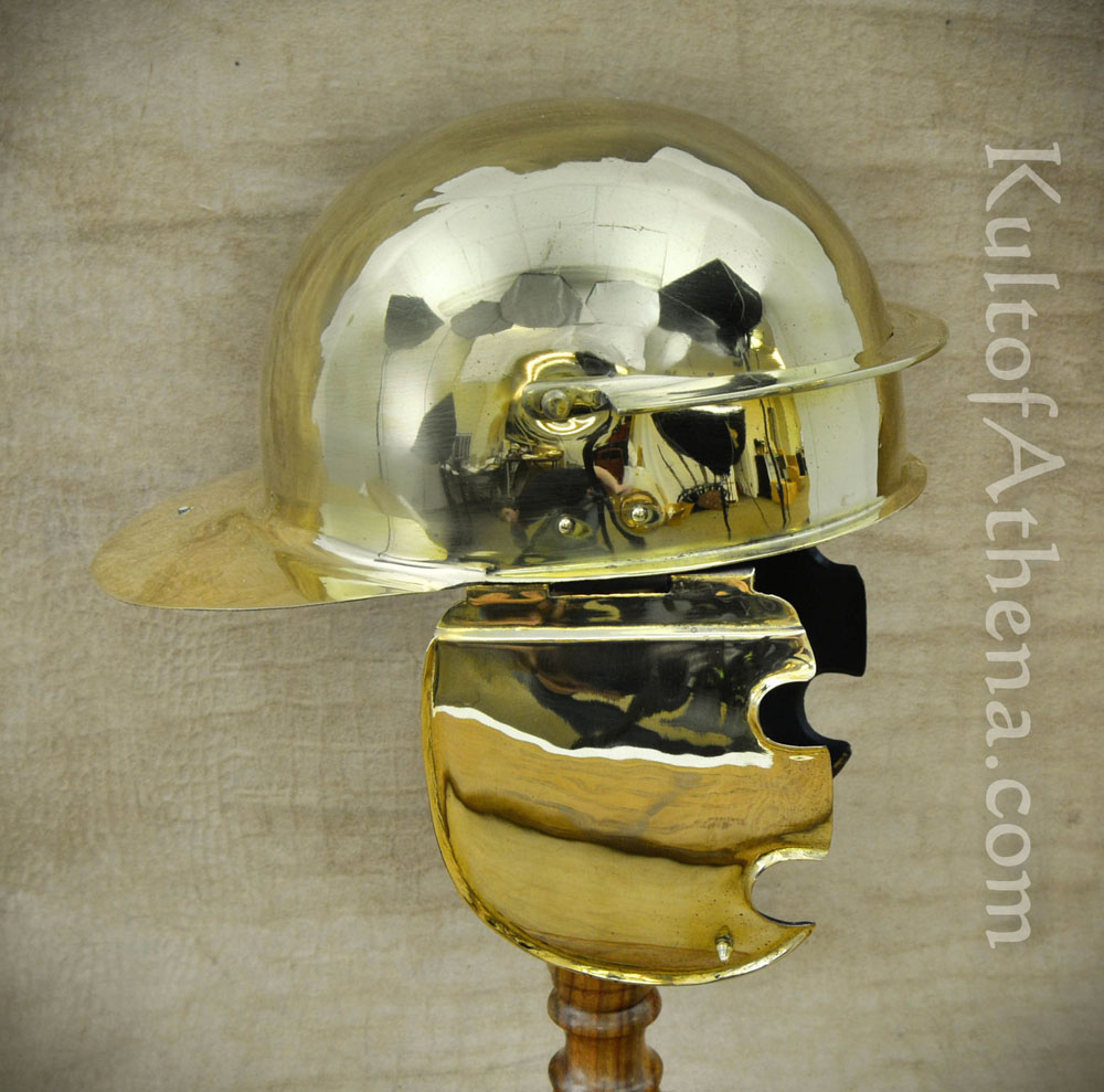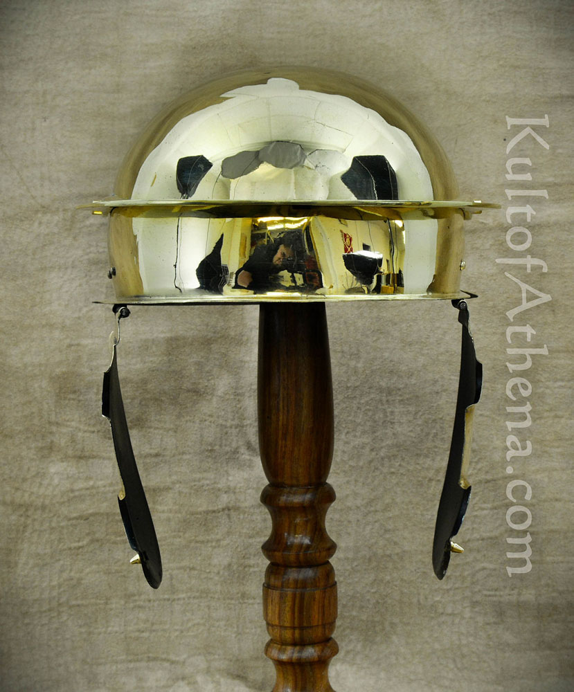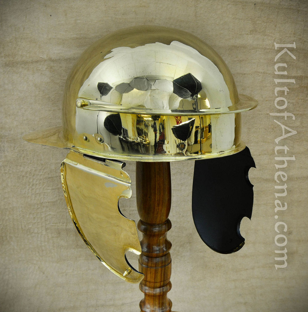 This Roman Coolus C Helm is crafted from 18 gauge brass and fitted with hinged cheekplates. The interior of the helmet is unlined and blackened; included with the helmet is a separate cotton padded arming cap.