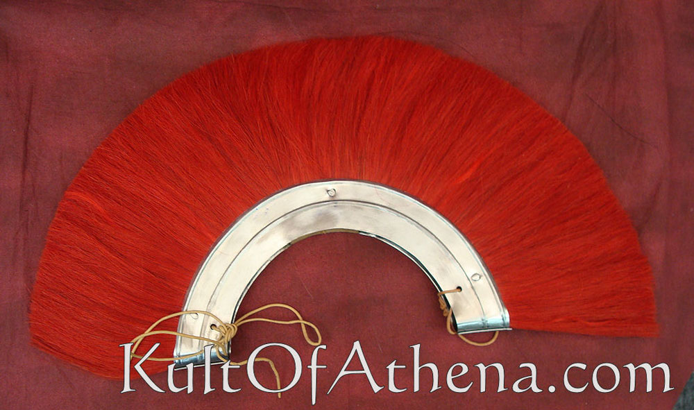 This roman crest is made to attach to a Roman helmet with a crest attachment slot and a crest holder. Can be mounted front to back or side to side depending on the holder used. Wood and steel crest box with bright red horse hair.