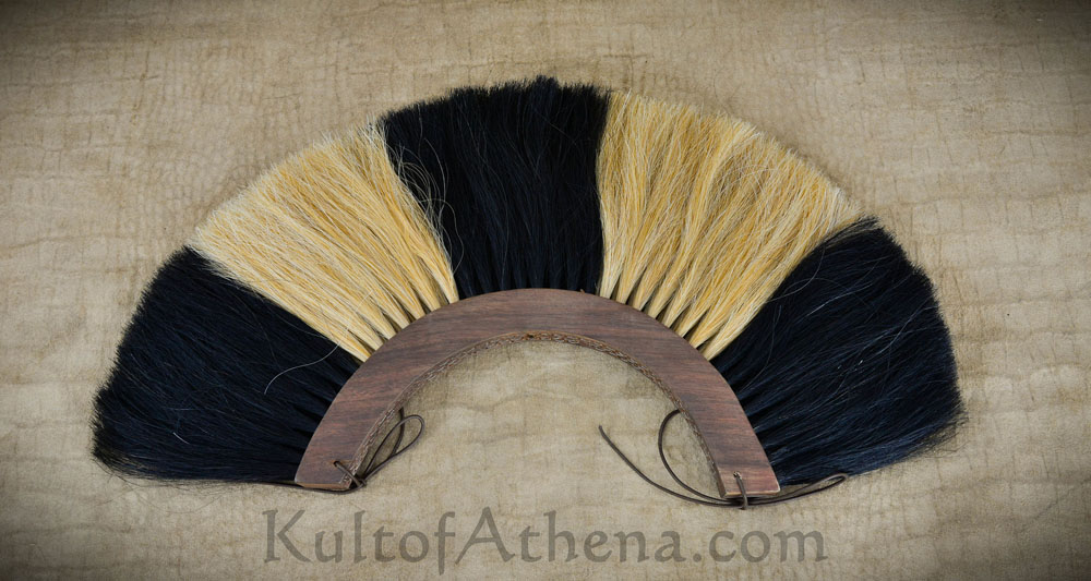 This bi-color Roman helmet crest is crafted from black and white horsehair which is mounted to a wooden base. The crest can be used as both a transverse and front-to-back crest depending on the type of crest holder used; there is a pre-drilled hole in the base to fit it to a holder. Included are leather cords to tie down and anchor the crest into position.