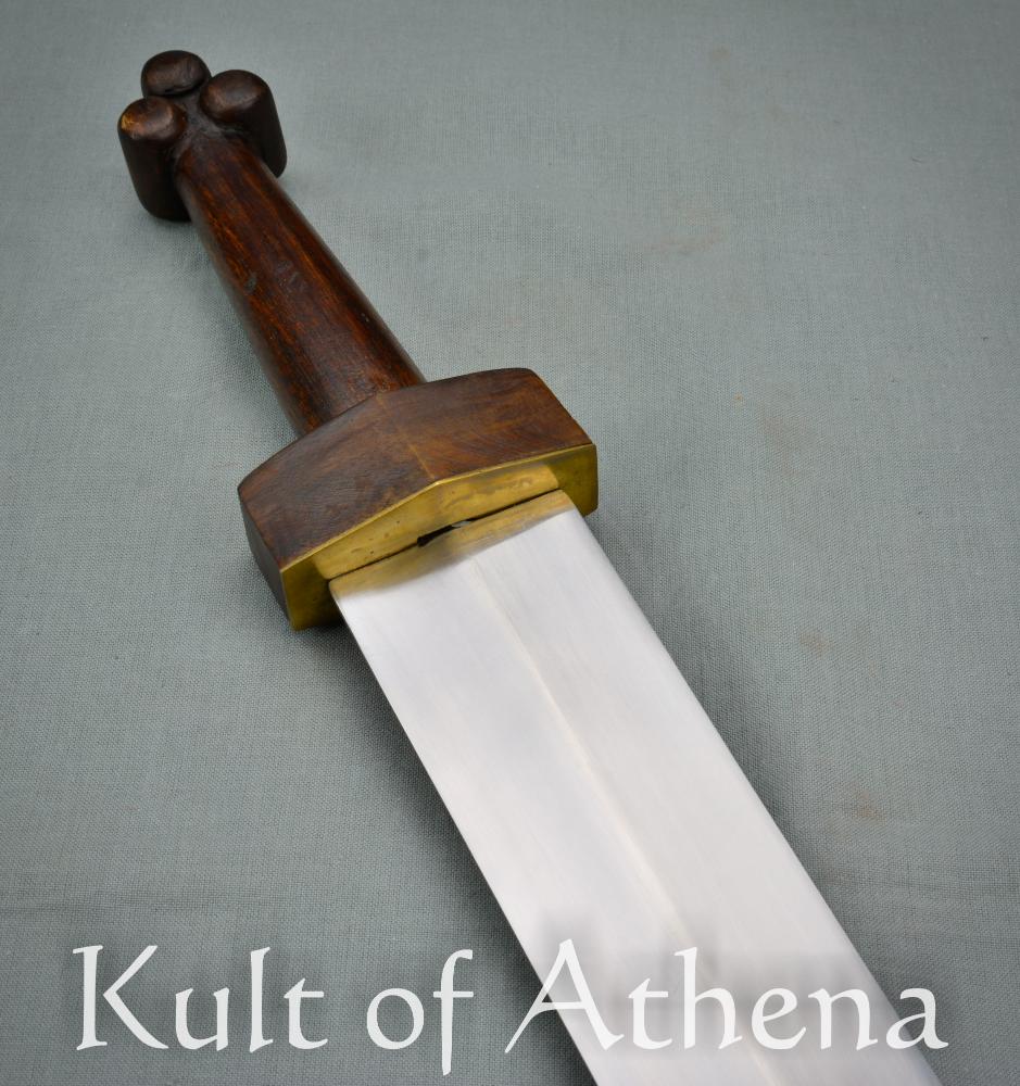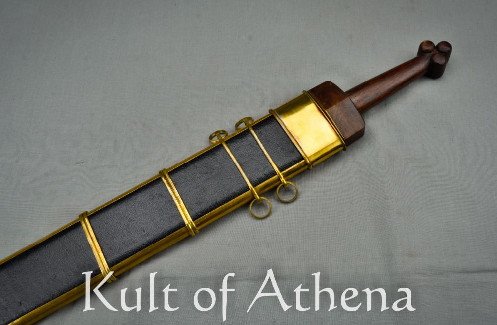 This early period Roman sword features an unsharpened carbon steel blade. The hilt is made of hard wood with a brass plate on the guard. The matching scabbard is made of wood with black leather wrap and brass accents. Includes 4 brass rings to hang the sword from a belt or baldric.