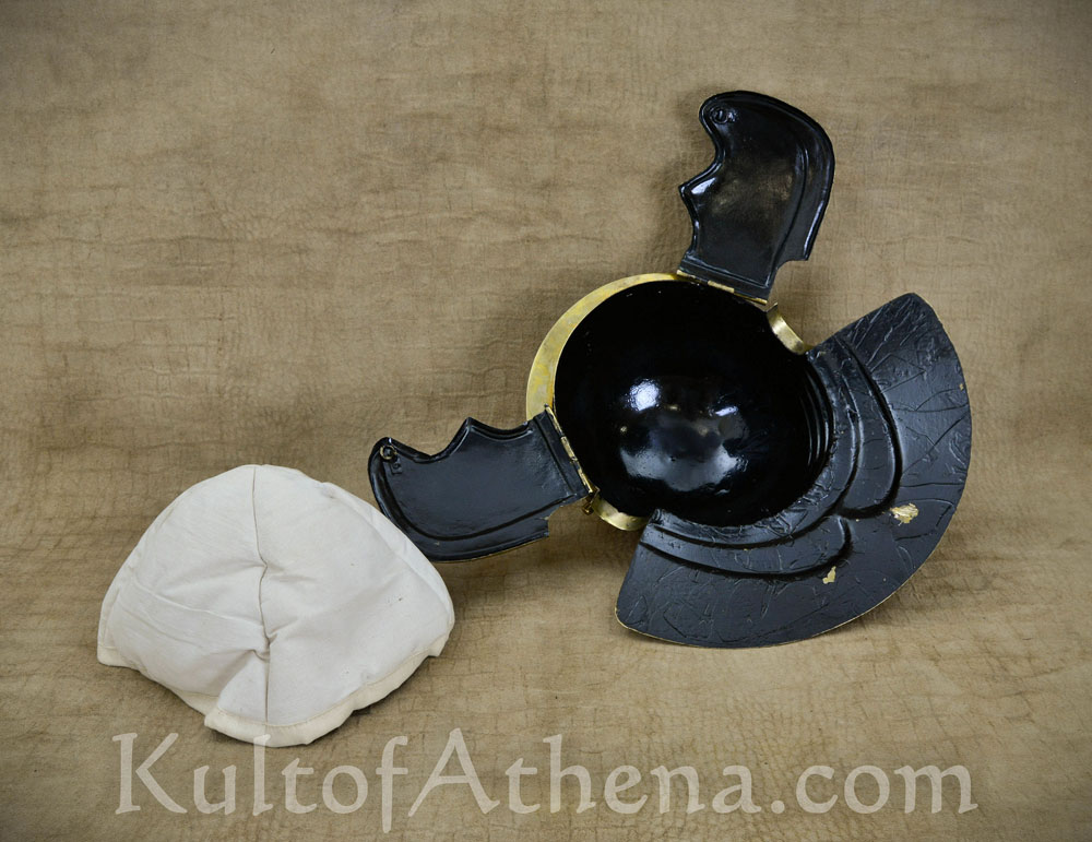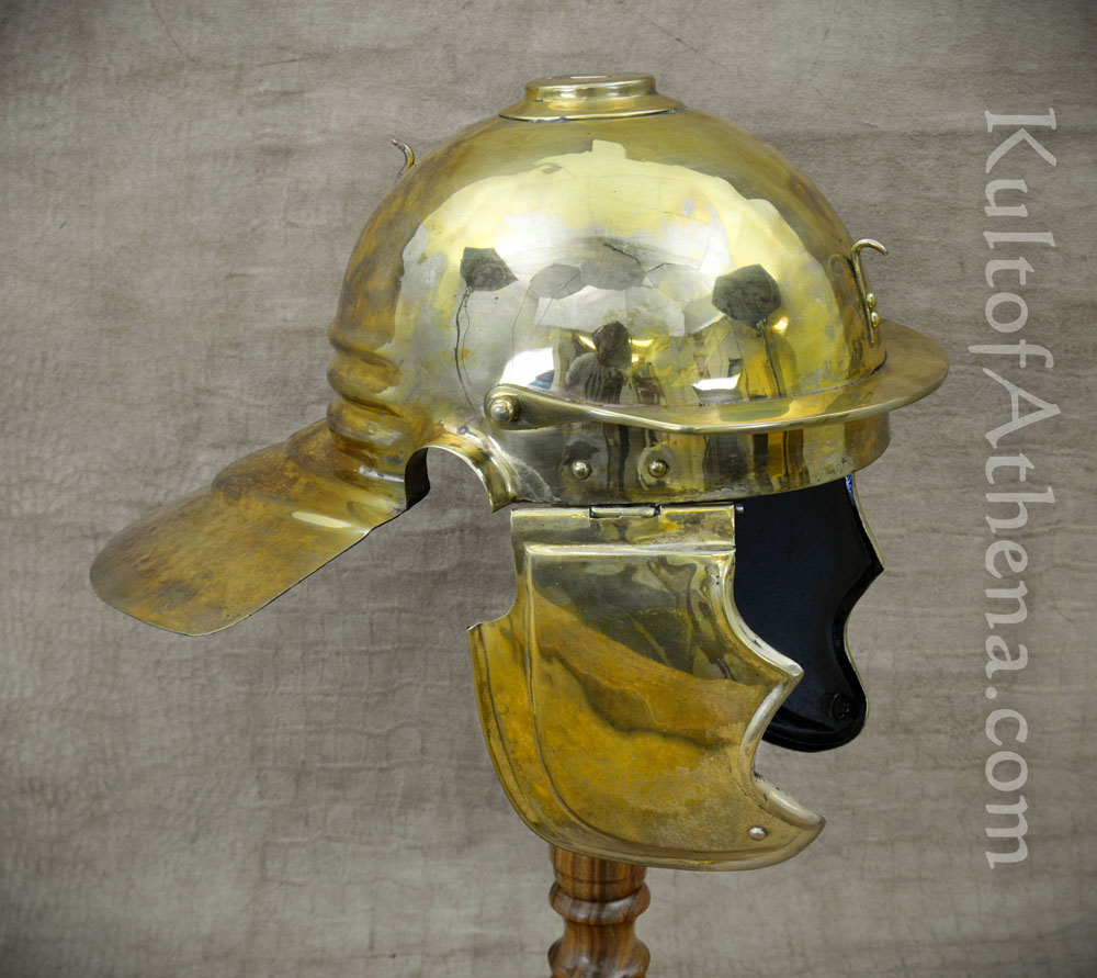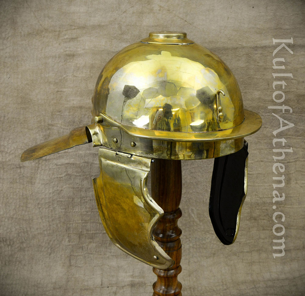 This Imperial Roman Italic C Helm is crafted from 18 gauge brass; the cheekplates are hinged and the helm has a slot at its top to accommodate a crest holder. Two brass hooks on the helm can be used to tie down and secure a crest. The hinged cheekplates have two integrated rings with which to tie a chin strap onto (chin strap or crest holder not included).