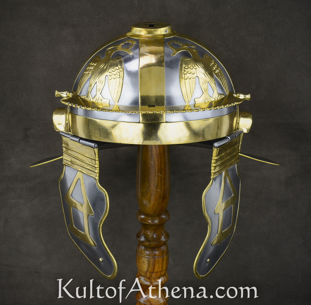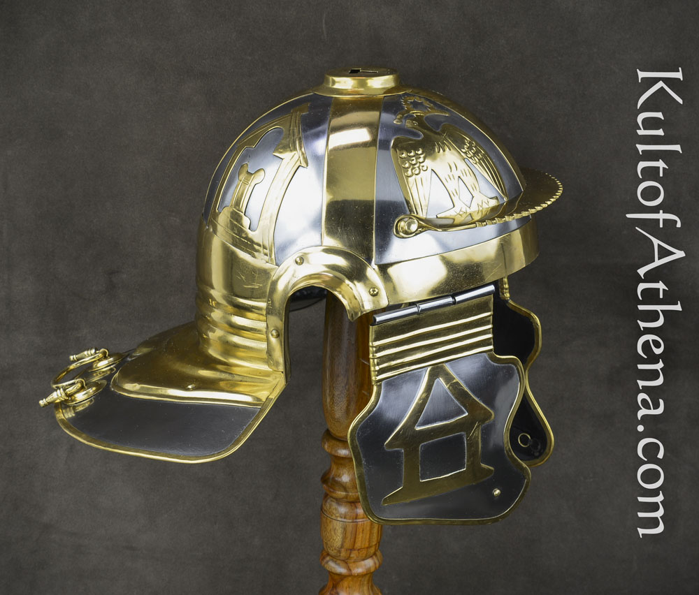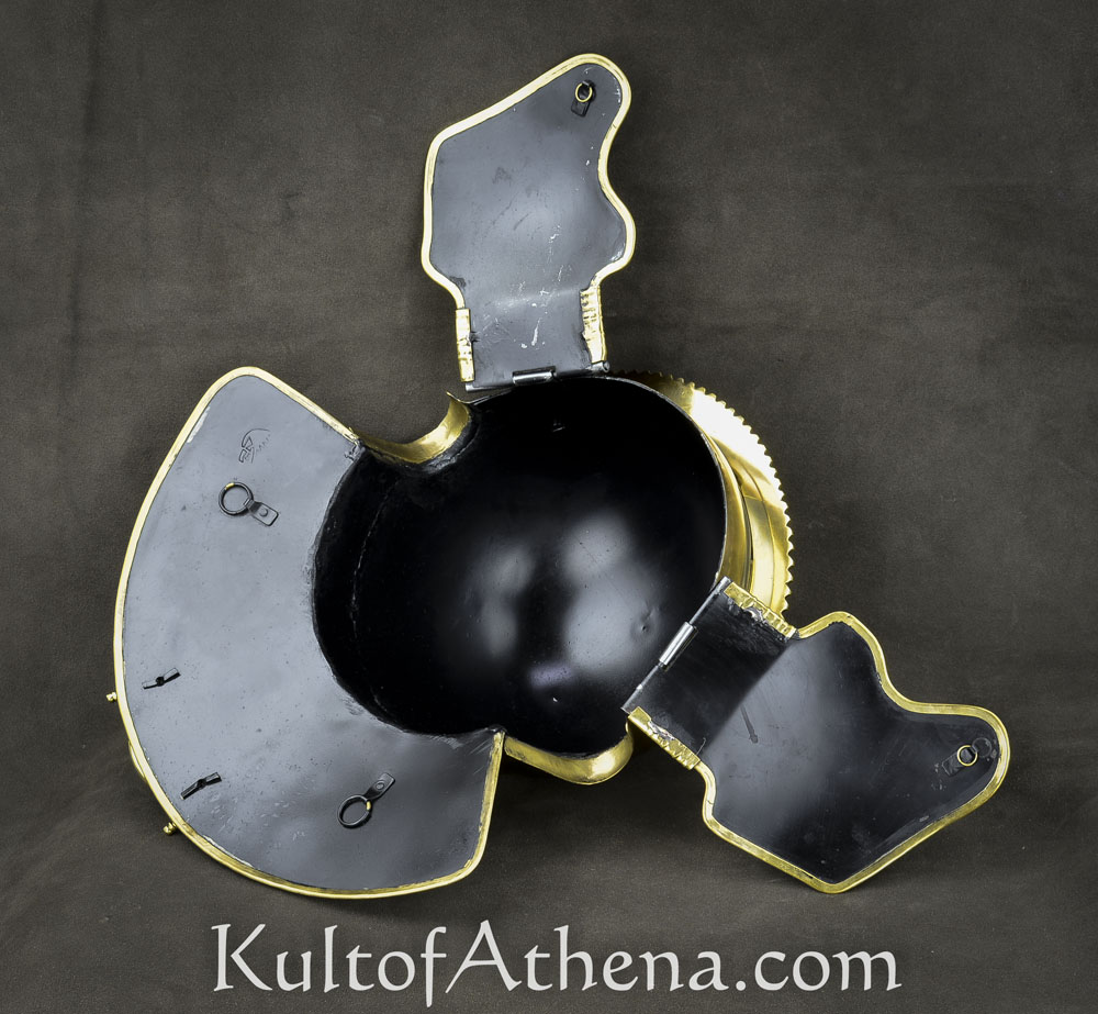 The Roman Imperial Italic D Helmet is constructed from steel and is thoroughly embellished in brass. The hinged cheekplates have small rings on the inside which allow for a chinstrap to be tied on and fastened. The slot at the top of the helmet can accommodate a helmet crest (not included). The interior of the helmet is blackened and unlined – included with the helmet is a separate padded cotton arming cap.