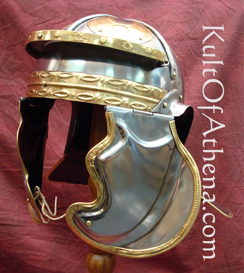 The Roman Imperial Italic G Helmet represents the evolution of the Legionary helmet. This model was in use in the 2nd century AD and features design improvements from the original Gallic inspired helmets from the earlier period, most notably the reinforcing bars on the top of the skull. Made of steel with hinged cheek pieces and brass accents.