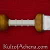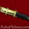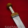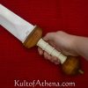The Roman Army’s approach to warfare was direct and pragmatic. It chose the Gladius as its principal sidearm because it was practical and efficient and excelled in any close combat situation. Early versions of the Gladius were wasp waisted with a long point that combined cutting power and stabbing ability in one handy weapon. The Roman Maintz Pattern Gladius features an unsharpened, functional, high carbon steel blade and a carved bone handle. Includes a matching wood scabbard with leather covering and brass accents.