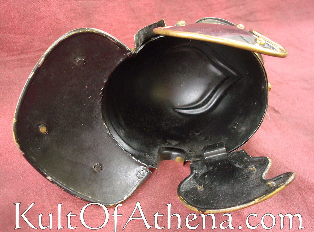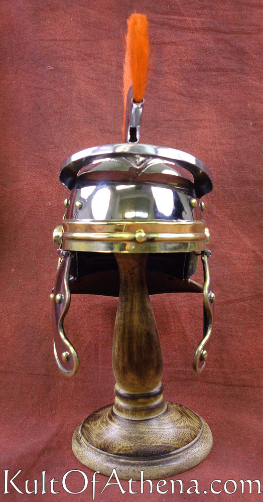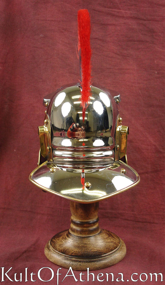 This miniature Roman Helmet is crafted from steel with a chrome finish and brass accents. The cheekplates are hinged and the red horsehair crest can be removed. Included is a wooden display stand.