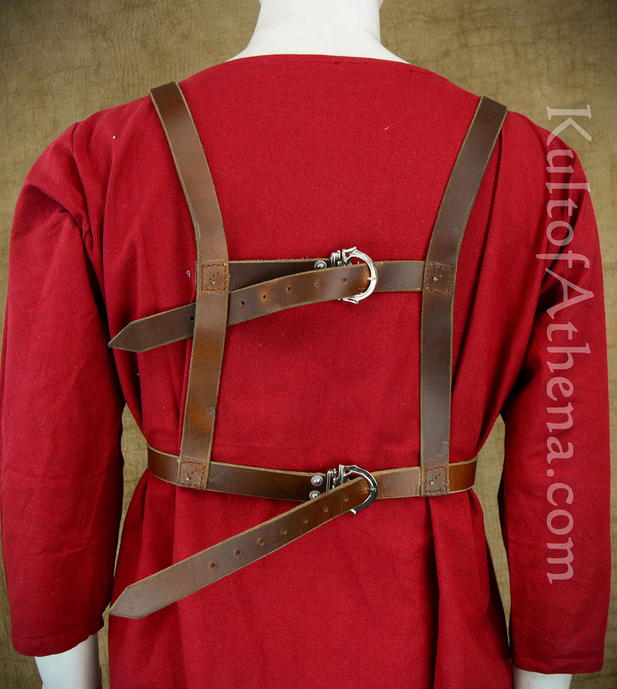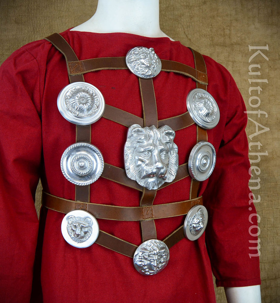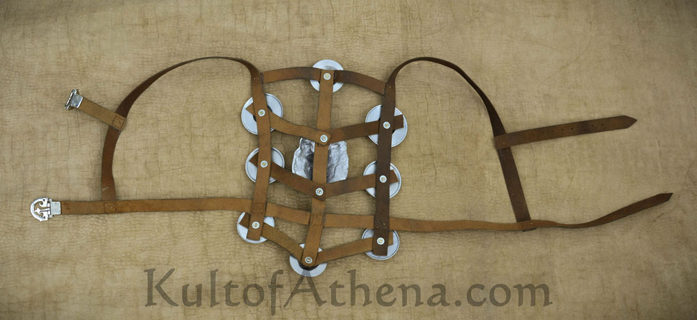 The Roman equivalent to military medals, a harness full of of Phalerae medallions such as this would be worn by a highly respected soldier. This recreation has medallions of aluminum to give it the appearance of silver and to also greatly reduce its overall weight. They are screwed onto a harness of leather and are buckled in the back with aluminum buckles and leather straps. It will adjust to fit.