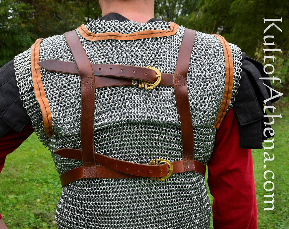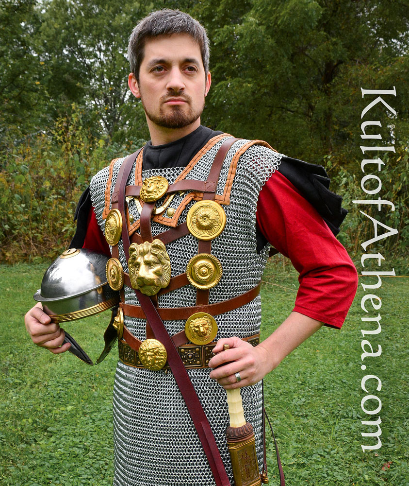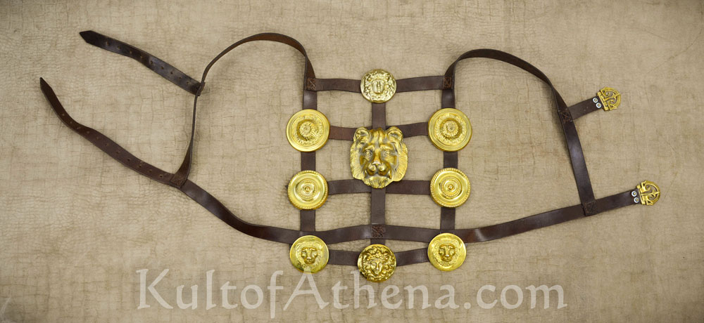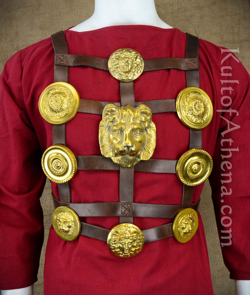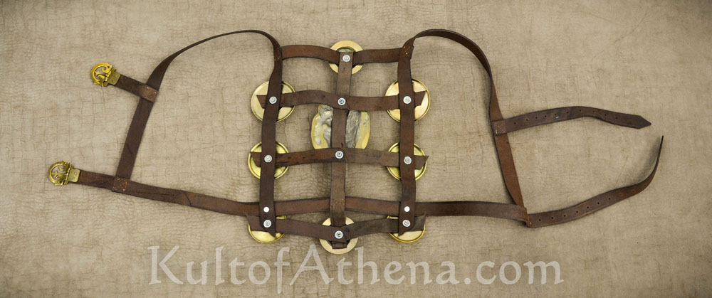 This Roman Phalerae harness has large medallions of brass screwed onto bands of thick leather. It is adjusted to fit and buckled in the back with a set of leather straps and brass buckles.