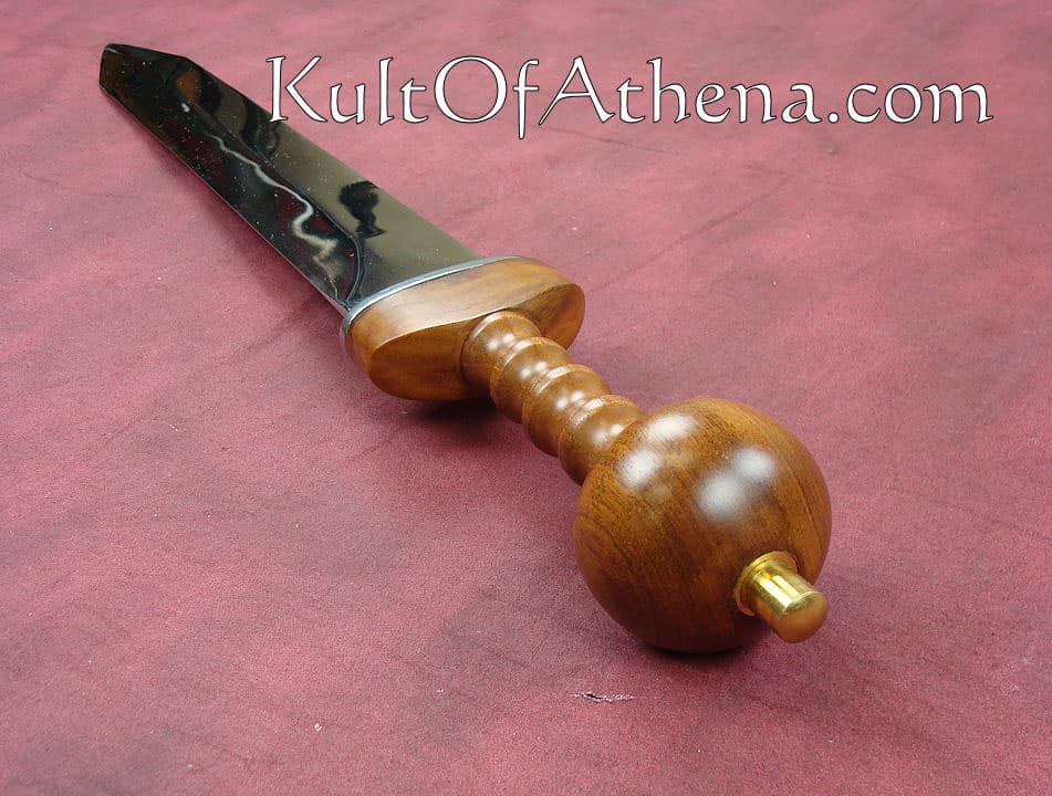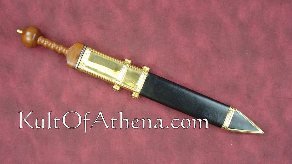 The sword that conquered most of the known world. The simple but brutally effective Roman gladius was the primary weapon of the Roman soldier. This version is based on historic examples excavated from the ruins of Pompeii and dates to about 100 AD. The Roman Pompeii Gladius features an unsharpened, functional, high carbon steel blade and turned handle of ash and maple wood. Includes a matching wood scabbard with leather covering and brass accents.