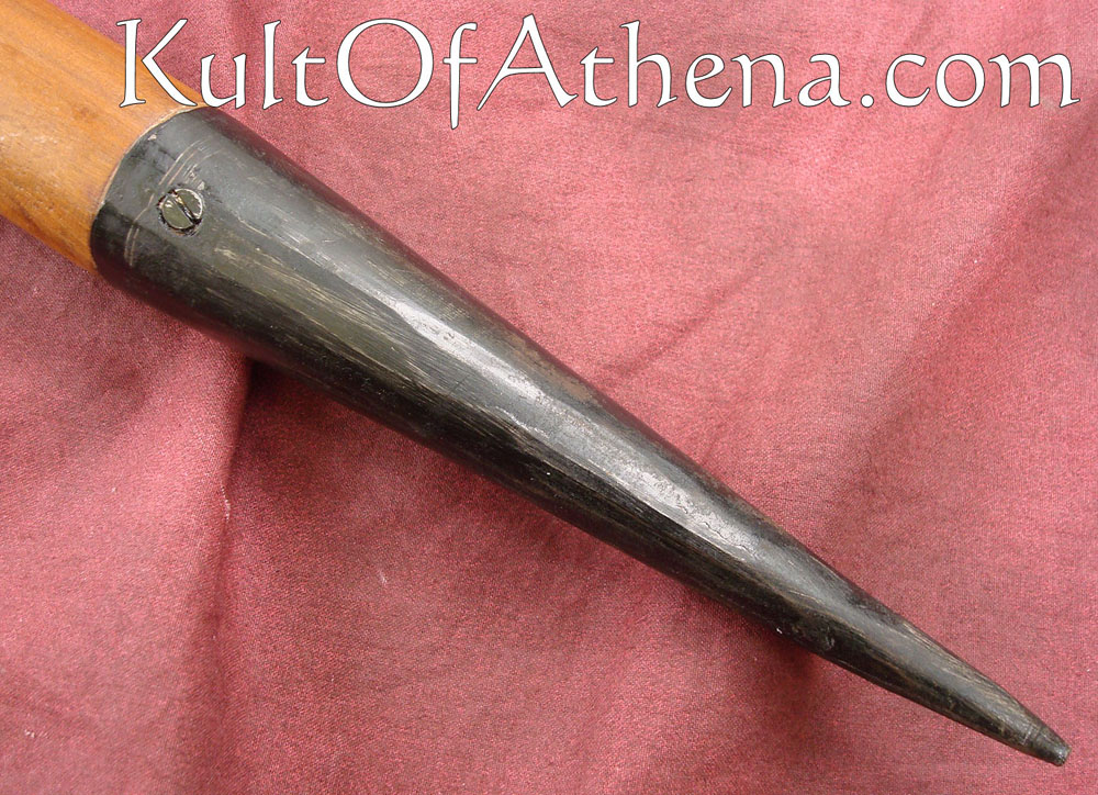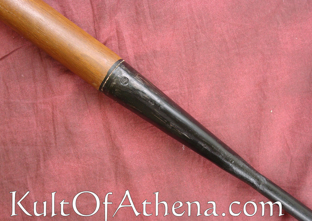 This pilum has a blackened steel head mounted onto a hardwood shaft. The butt-cap is tapered wood with blackened metal plate overlaid.