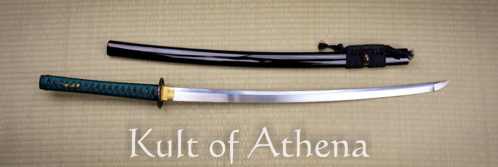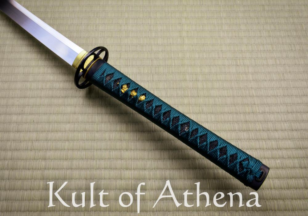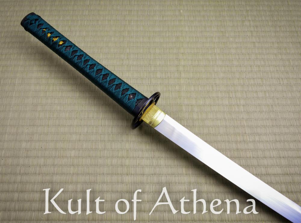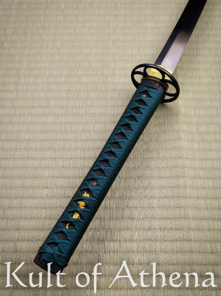 Bought as a blem, got a blem. Good enough for a cutting practice blade. Cuts are powerful yet nearly effortless to execute. Spine is nice and thick all the way to the tip taper, this is a heavy cutting sword after all, but this leads to greater strength in the blade and also the body. I really dig the brown buffalo horn fittings on the saya, thats something thats new to me. Ito could definitely have been wrapped a little tighter, but the ray skin should hold it in place, but the menuki do move around if intentionally manipulated. Overall an impressive weapon with its own simple beauty if you dont nitpick the finish. Ito is a dark green color. Not quite in the teal spectrum.