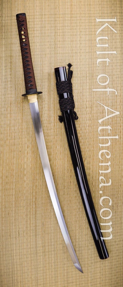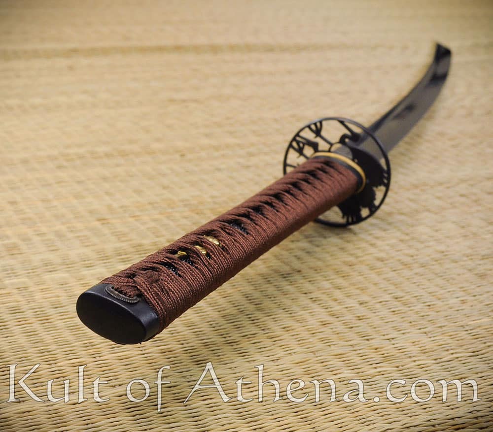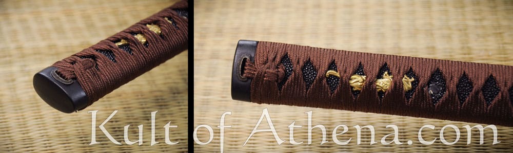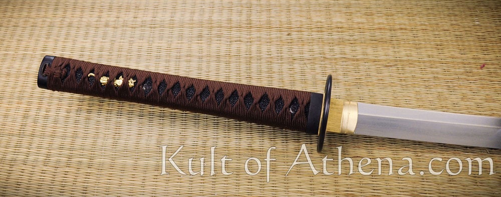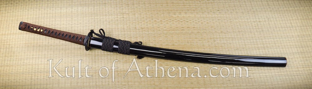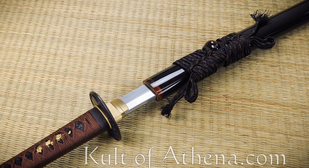 The fittings of this katana; the tsuba, fuchi and kashira are of black iron. The seppa and habaki are of brass. The wooden grip is wrapped with blackened rayskin and overlaid with knotted silk tsuka-ito cord. Two brass menuki are woven into the grip. The wooden saya scabbard is coated with black lacquer. Its Kojiri, Koiguchi and Kurigata are of polished buffalo horn. A sageo cord of silk is knotted to the saya. Comes with a black cloth sword bag.