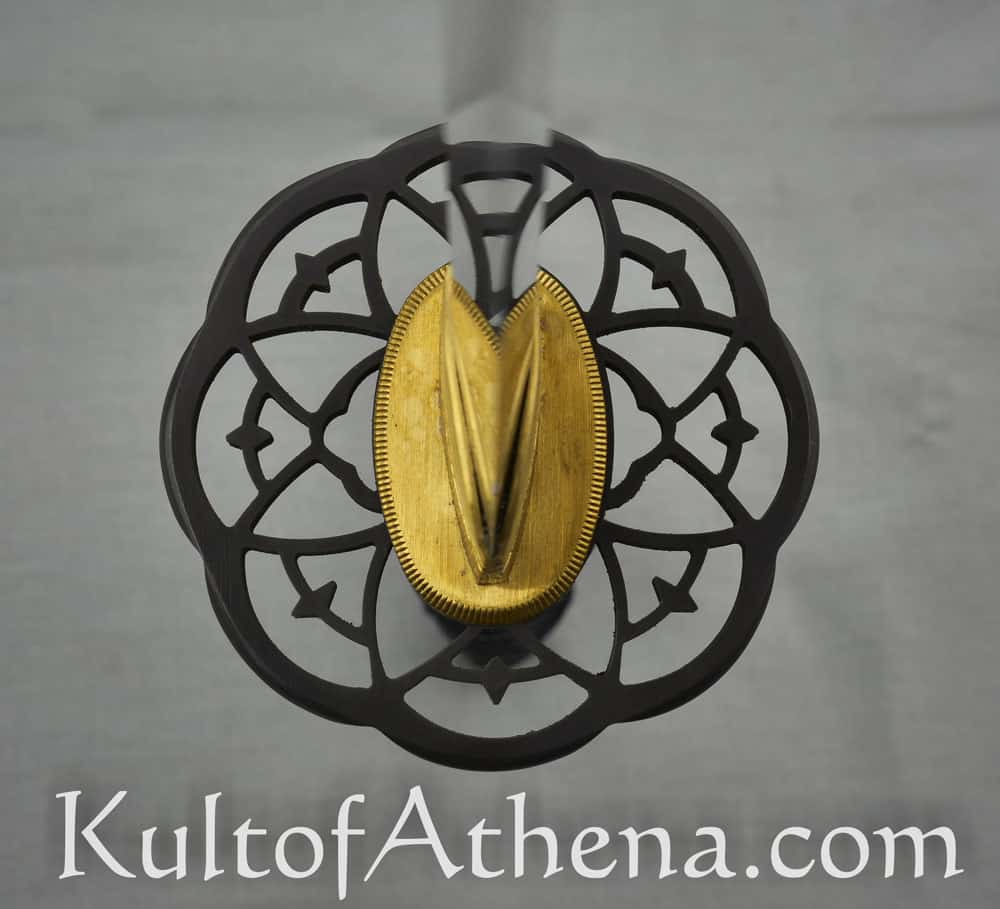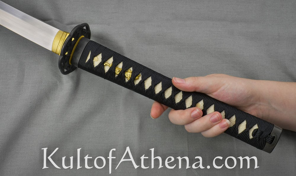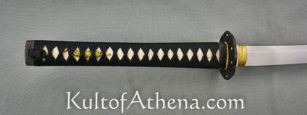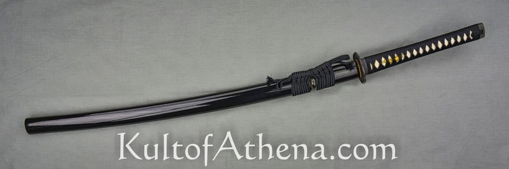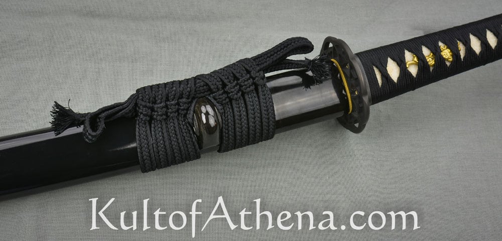 Ronin’s Dojo Pro Line Model 5 katana features a through hardened 1060 carbon steel blade, blackened iron tsuba a wood saya with hand cut and polished buffalo horn Kurikata, Koguchi and Kojiri. The ito (grip wrap) is silk.