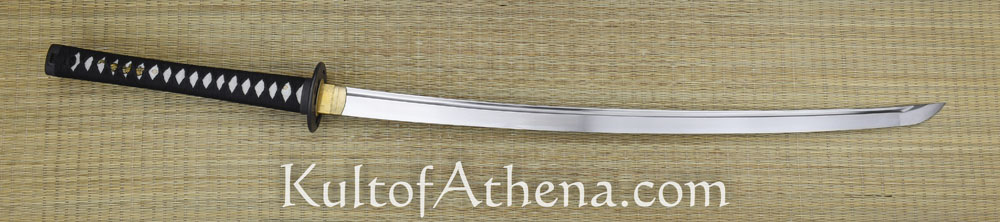 The fittings of this katana; the tsuba, fuchi and kashira are of black iron. The seppa and habaki are of brass. The wooden grip is wrapped with rayskin and overlaid with tightly twisted silk tsuka-ito cord. Two brass menuki are woven into the grip. The wooden saya scabbard is coated with black lacquer. Its Kojiri, Koiguchi and Kurigata are of polished buffalo horn. A sageo cord of silk is knotted to the saya. Comes with a black cloth sword bag.