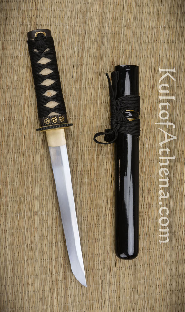The Ronin Katana Dojo Pro #2 Tanto has a straight, stiffened and thick-spined blade optimized for piercing thick clothing and the weak points of armor with efficient ease. The blade is forged from 1060 high carbon steel; the tsuba is iron and the habaki and seppa blade mountings are cast from brass. The fuchi and kashira of the hilt are antiqued metal and the wood tsuka grip is fitted with genuine rayskin panels and finished with a knotted tsuka ito wrap. Included with the tanto is a wooden scabbard with a glossy, black lacquered finish and a sageo cord. A cloth tanto bag is included.