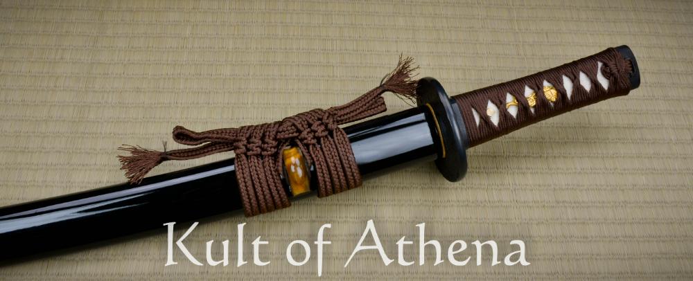 The wooden saya scabbard has a Kurikata, Koguchi and Kojiri of polished buffalo horn; the wooden parts of the scabbard were finished with a gloss-finish black lacquer and a black sageo cord to match the color of the grip. The sword comes with a cloth sword bag.