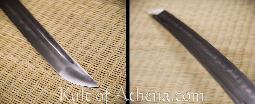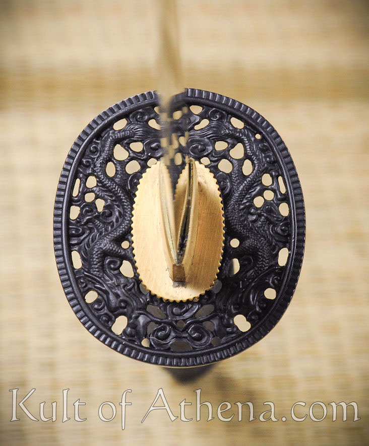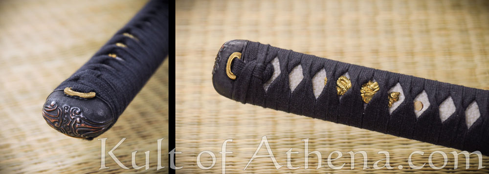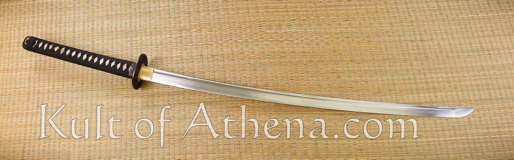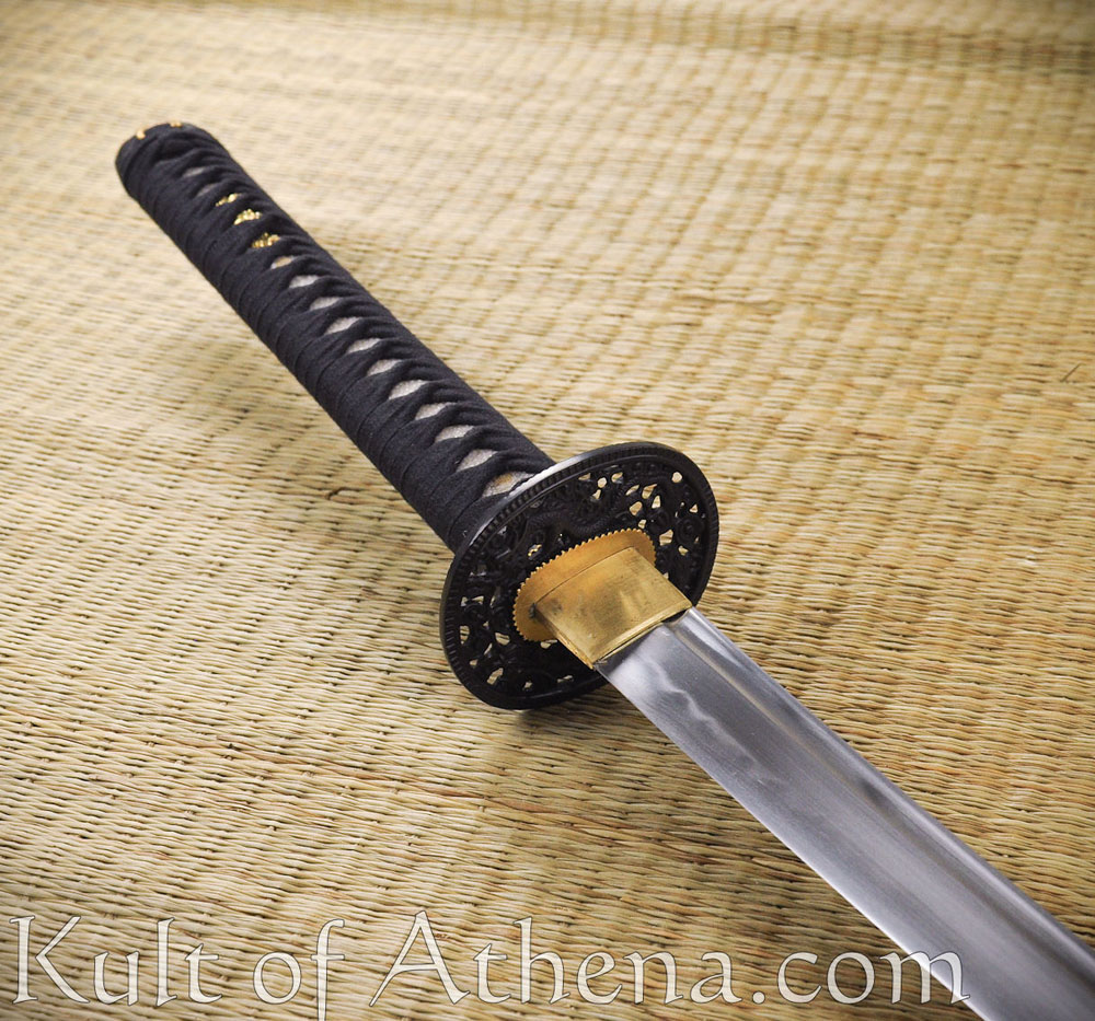 The Ronin Katana #4 has a sharp, 1045 high carbon steel blade that has been differentially tempered, leaving a visible, wave-like hamon of harder edge steel. The tsuba, fuchi and kashira grip fittings are of a zinc alloy. The habaki and seppa are of brass. The wooden tsuka grip is wrapped with rayskin and overlaid with knotted black cotton Ito cord. A pair of menuki of zinc alloy have been fitted beneath the Ito grip wrap.