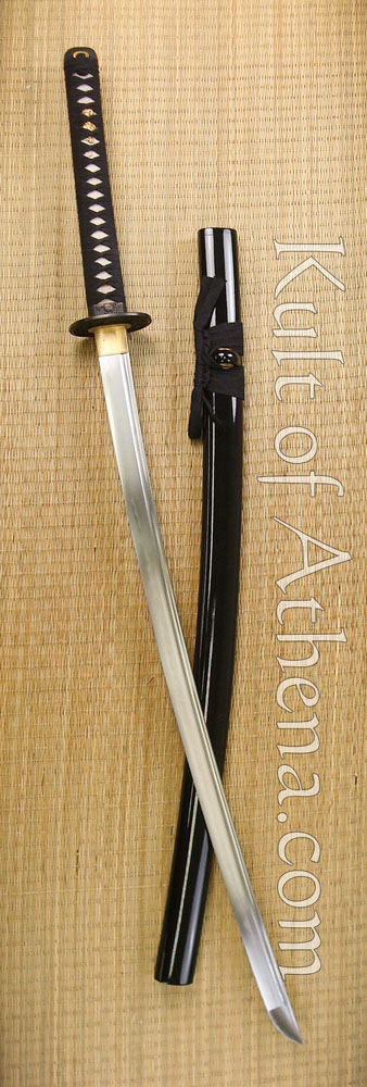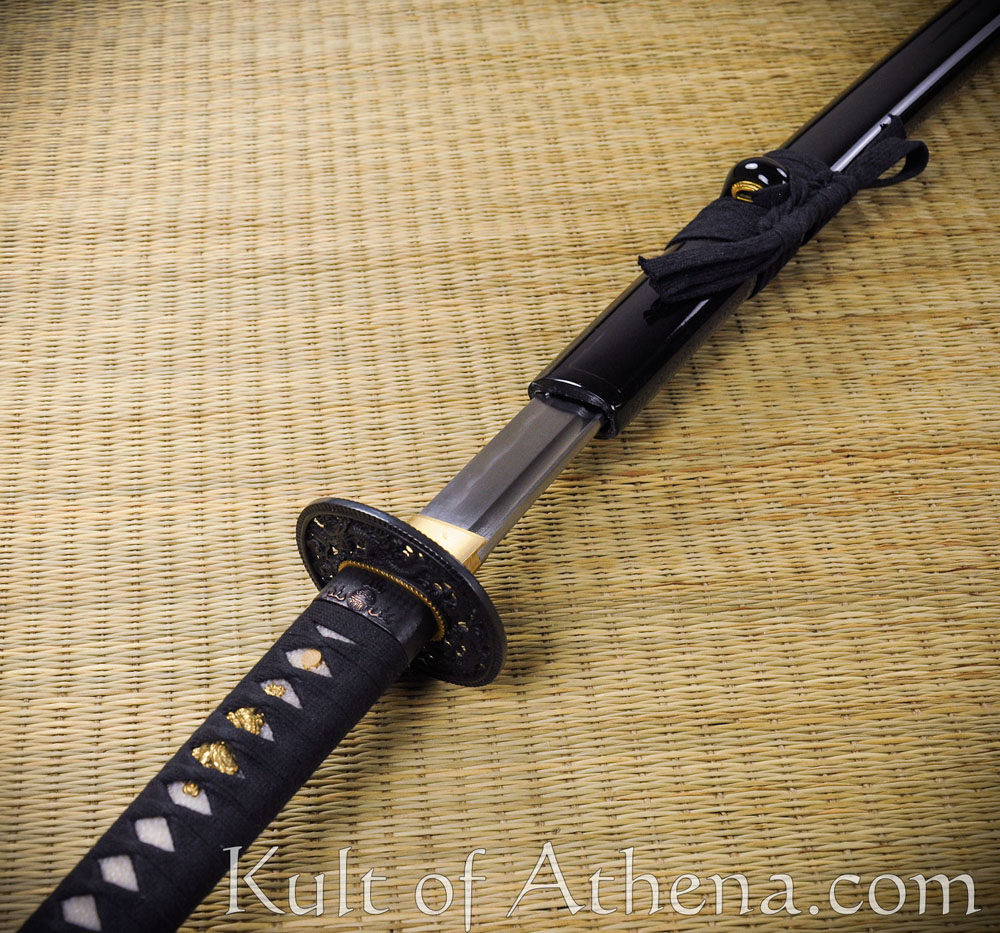 The Saya scabbard of wood is coated with black lacquer and fitted with a black cotton Sageo cord. Comes with a black cloth sword bag.