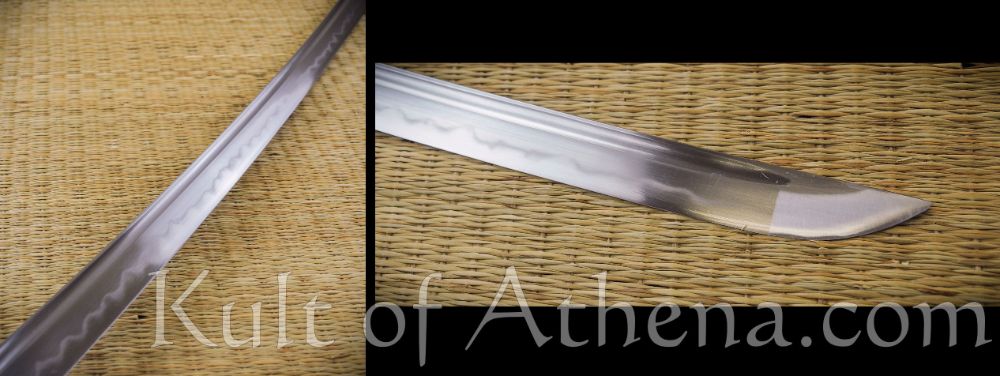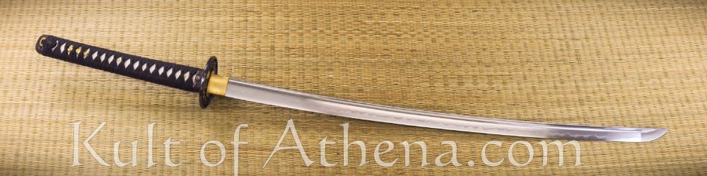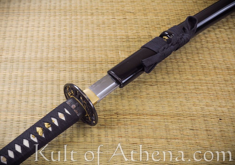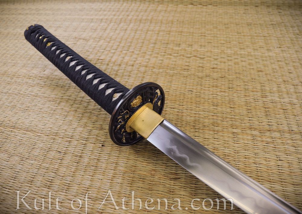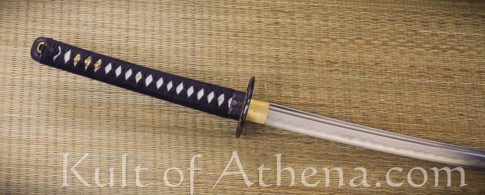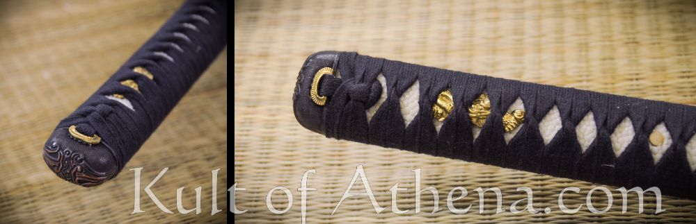 The Ronin Katana #8 has a sharp, 1045 high carbon steel blade that has been differentially tempered, leaving a visible, wave-like hamon of harder edge steel. The tsuba, fuchi and kashira grip fittings are of a zinc alloy. The habaki and seppa are of brass. The wooden tsuka grip is wrapped with rayskin and overlaid with knotted black cotton Ito cord. A pair of menuki of zinc alloy have been fitted beneath the Ito grip wrap.