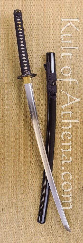 The Saya scabbard of wood is coated with black lacquer and fitted with a black cotton Sageo cord. Comes with a black cloth sword bag. This type of sword is considered an entry-level cutter by Ronin Katana. Ronin advises that they are safe to use against single soaked tatami mats, as well as water bottles and similar targets. Ronin discourages their use against hard targets, as well as thick, hard plastic jugs
