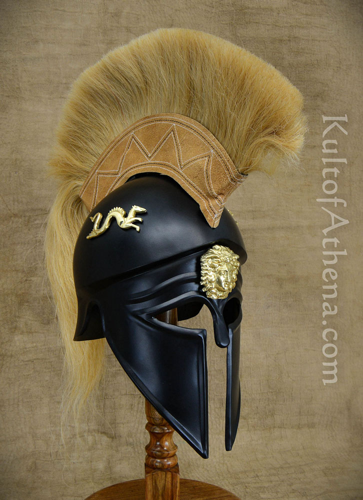 The Royal Corinthian Helm is crafted from 18 gauge steel with an all-black finish and embellished with brass fittings. The included horsehair crest with a leather and wood base can be slotted onto the helm.