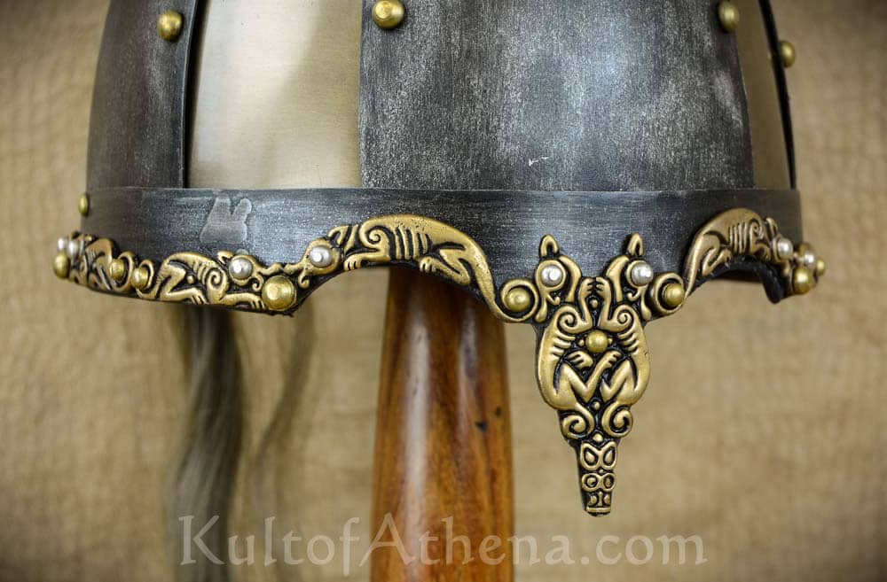 This Viking Rus Spangenhelm is crafted from 18 gauge steel with a bronzed finish; riveted onto this shell are darkened and antiqued plates of brass riveted steel. A hair plume is fitted atop the head. The helm is embellished with antiqued brass Viking wolves riveted onto the base of the helm.