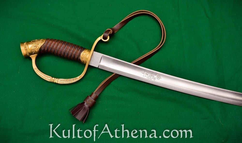 The hilt is crafted from cast brass which has reproduced the Imperial markings and embellishment of historical originals in great detail; its grip is formed from well-carved and polished wood. Unlike more plain swords issued to ordinary Dragoon cavalrymen, this Officer’s Saber is heavily embellished with Perovskia flower (Russian Sage) design and scrollwork. The sword is paired with a durable scabbard of rosewood which is bound in stitched black leather and completed with detailed brass ornamentation to match the sword. The hilt is completed with a leather sword knot which can function as a wrist lanyard. The sword has a single hanging ring to allow it to be worn blade-side-up in the traditional manner to allow it to draw and cut from the scabbard in a single motion.