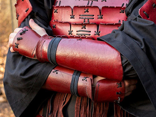 Comfortably secure the Samurai Bracers by lacing the leather cords on the underside and tightly wrap the heavy cotton fabric around the wrist. Attach the handguard by gripping the cotton cord around the knuckles. Inspired by Asian traditional armour, these bracers are perfectly matched with other products from Epic Armourys Asian Universe.