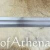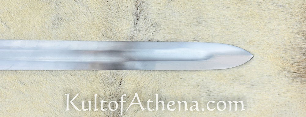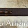 Included with the sword is a wooden scabbard which is tightly bound in leather and accented with an antiqued brass chape and locket. A wooden suspension loop is secured with leather bands and this suspension loop can be used to sling this sword and scabbard from your own baldric or belt.