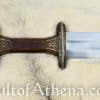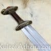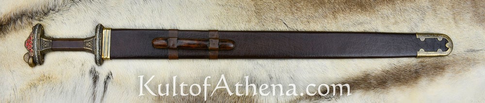 This 8th Century Scandinavian Vendel sword has a hilt which is richly adorned in well-cast detailing which marks it as a weapon of status for an elite Vendel warrior or Chieftain. The blade is tempered high carbon steel which is stoutly mounted into a hilt of antiqued brass which is embellished with tin-plated brass banded accenting. In this era tin was often used as a decorative element and it was prized for its silver-like appearance. The grip is leather over hardwood and the pyramidal shaped pommel is inlaid with vibrant scarlet enamel to recreate the vibrant inset garnet gemstones of originals. Like original Vendel swords, this one has a two-part pommel with its cap secured by twin rivets. Like many later period originals, the ring on the pommel is in a stylized and symbolic form rather than being a freely moving component.