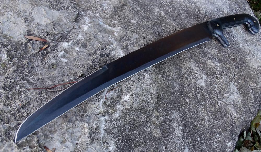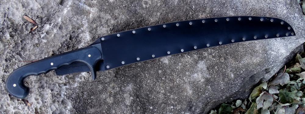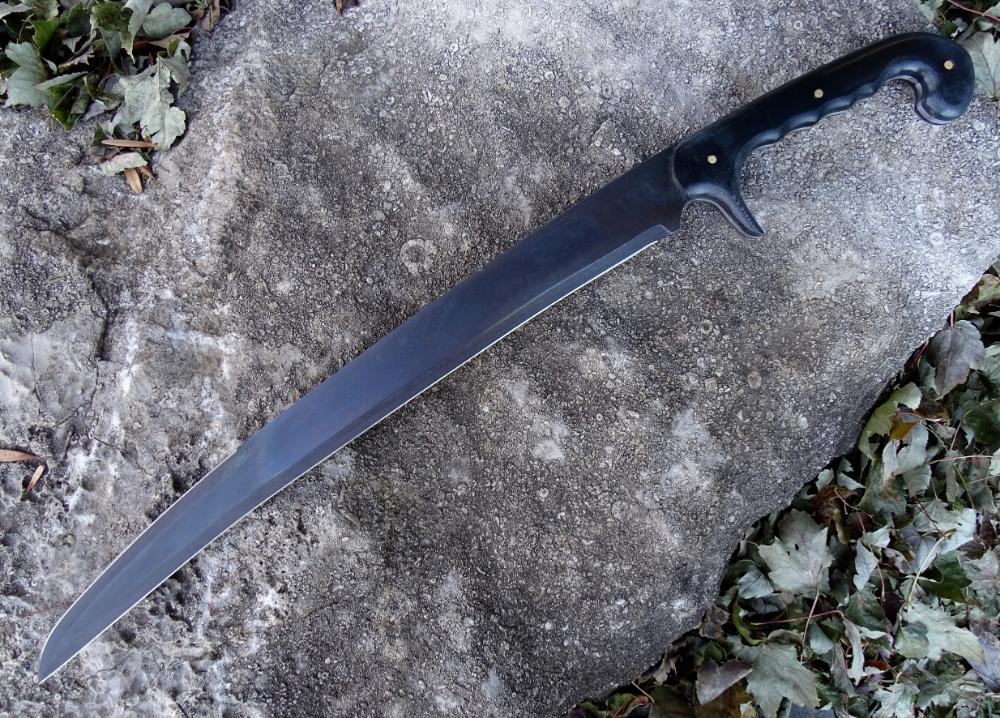 The blade is crafted from 1095 high carbon steel which has been expertly tempered to a 57 HRc hardness and finished with a darkened blued finish. It is made as robustly as is possible with its blade and tang being made from a single solid piece and is finished with black linen micarta composite grip scales which are solidly riveted directly to the tough blade tang. Included is a leather sheath to complete the sword.