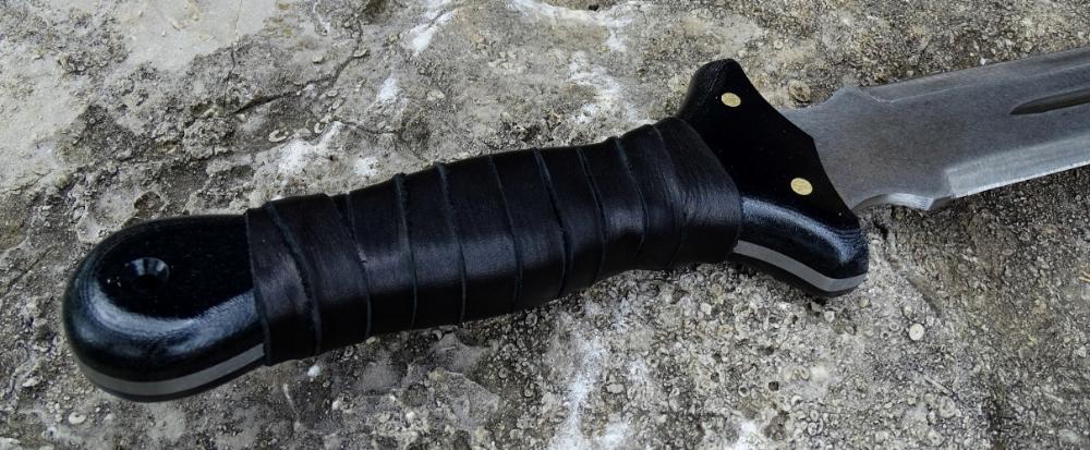 The blade is crafted from 1095 high carbon steel which has been expertly tempered to a 57 HRc hardness. It is made as robustly as is possible with its blade and tang being made from a single solid piece and is finished with black linen micarta composite grip scales which are solidly riveted directly to the tough blade tang and overlaid with a leather grip wrap. Included is a leather sheath to complete the sword.