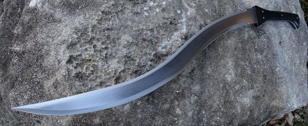 The Mummy Sword by Scorpion has a well-tempered blade of durable 1095 high carbon steel with a sharp edge. The sword is crafted as durably as possible with a full tang construction by riveting its composite black micarta scales directly to the thick blade tang. Included is a sheath of thick and riveted black Buffalo Culatta leather. The last picture shows and example of this type of sheath.