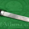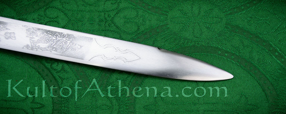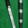 This Scottish Dirk has a blade of high carbon steel with embossed thistle design on both sides. The bolster and pommel cap are steel and the grip is carved and etched wood studded with steel. The scabbard is crafted from wood and is overlaid in black leather and finished with steel fittings.