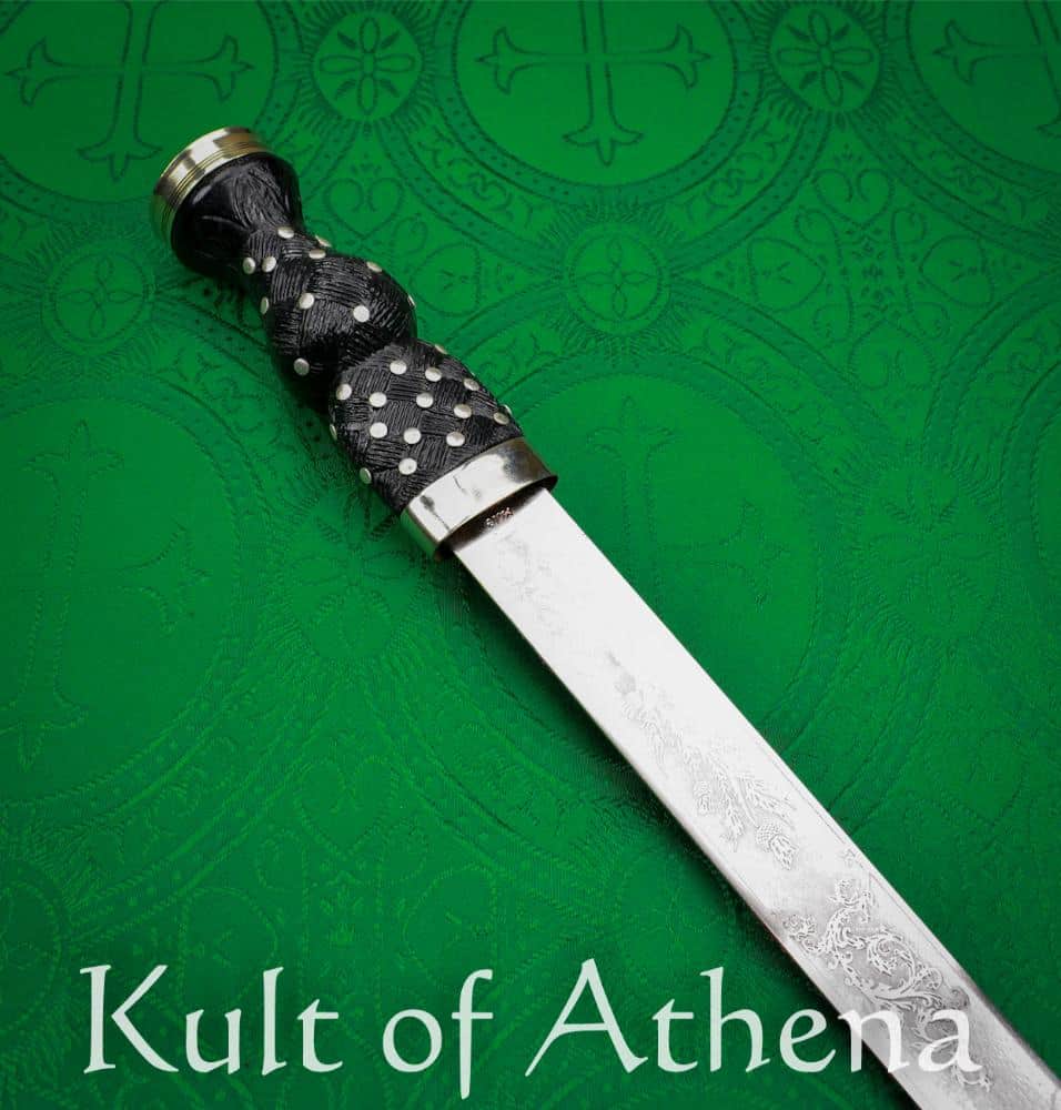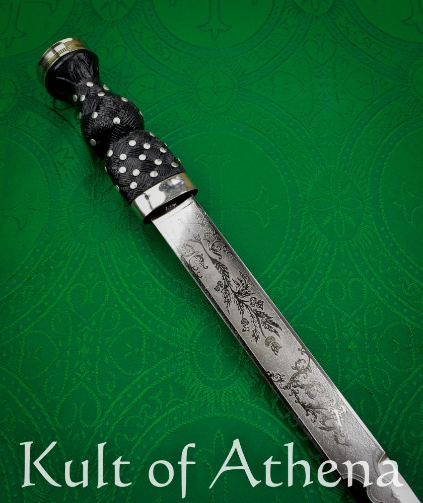 This Scottish Dirk has an embossed blade of high carbon steel. The hilt fittings are of metal. The grip is of faux ebony and has integrated pins of steel. The wood core scabbard is tightly wrapped in black leather and has accents of metal.