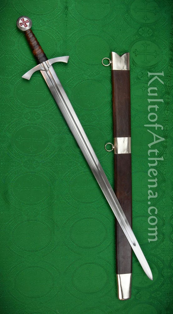 The Scottish Knight Templar Sword has a blade forged from EN45 high carbon steel; the crossguard and pommel are mild steel and the wooden grip is tightly overlaid in a spiralled leather grip wrap. On both sides of the pommel the inset Templar Cross is picked out and detailed in scarlet enamel.