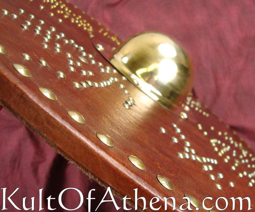 This wooden targe is covered with leather in the front. The back is animal skin. The targe is decorated with brass studs and a brass shield boss.