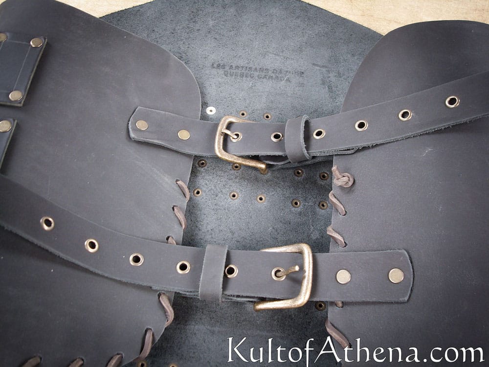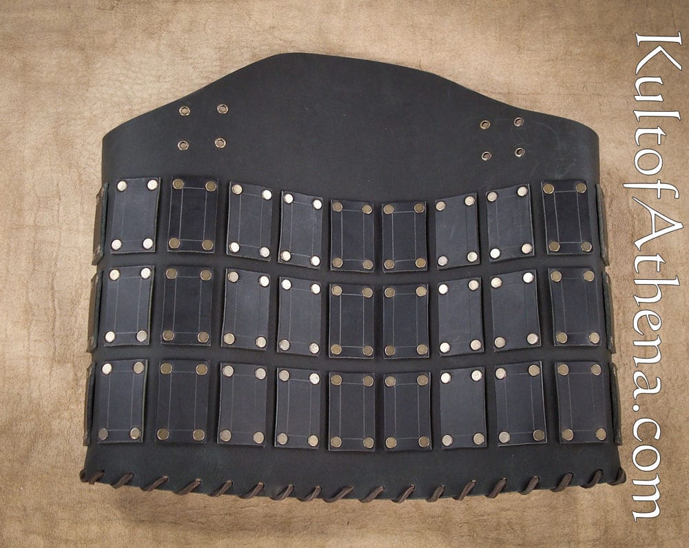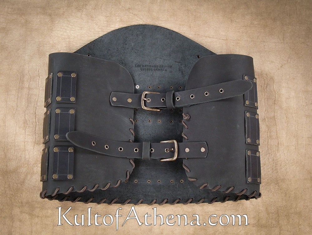 Made in Canada, this lower torso section of the leather Scoundrel torso armor is crafted from thick black leather that is overlaid with many riveted panels of black leather plates. Its bottom and the back have decorative spiralled leather ties sewn into the edges. The armor is adjusted to size with straps and buckles in the back. It has brass eyelets at the top that allow it to be tied onto an upper torso armor.