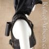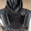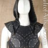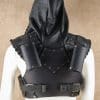 Made in Canada, this upper section of the leather Scoundrel torso armor is crafted from thick black leather that has been securely riveted together with antiqued brass rivets. It is adjusted to size with two leather straps with antiqued brass buckles. It has an integrated hood of soft black leather that has been riveted into the armor. It has two weapon holders on the back that can be removed with a buckle if desired.